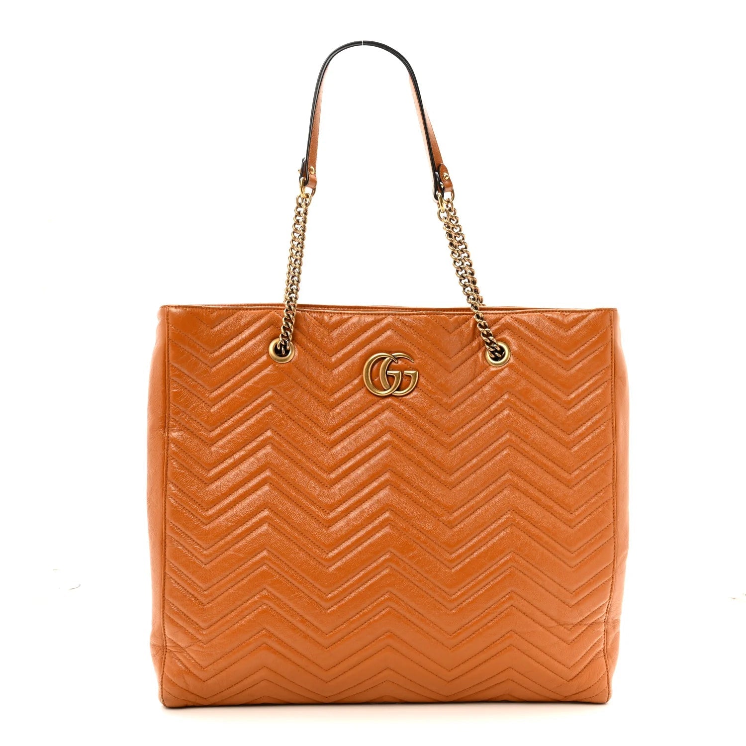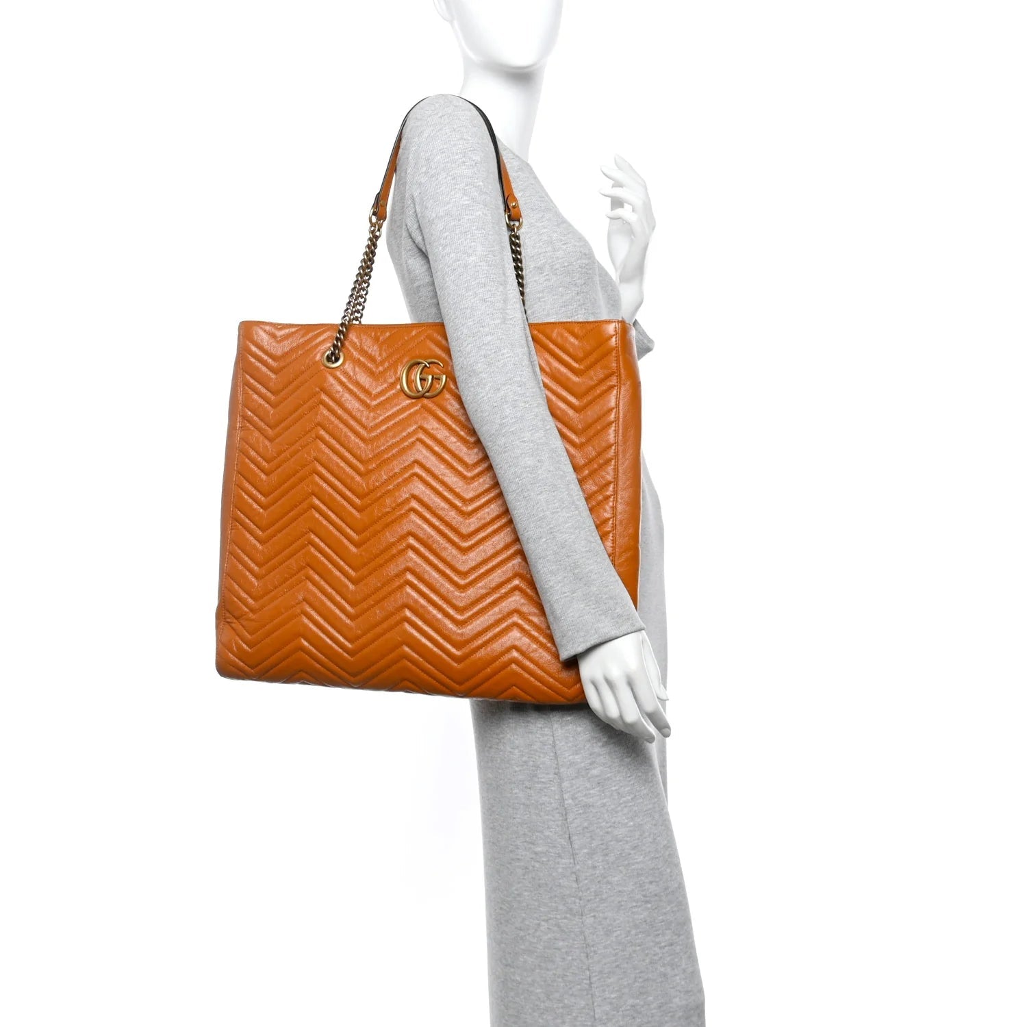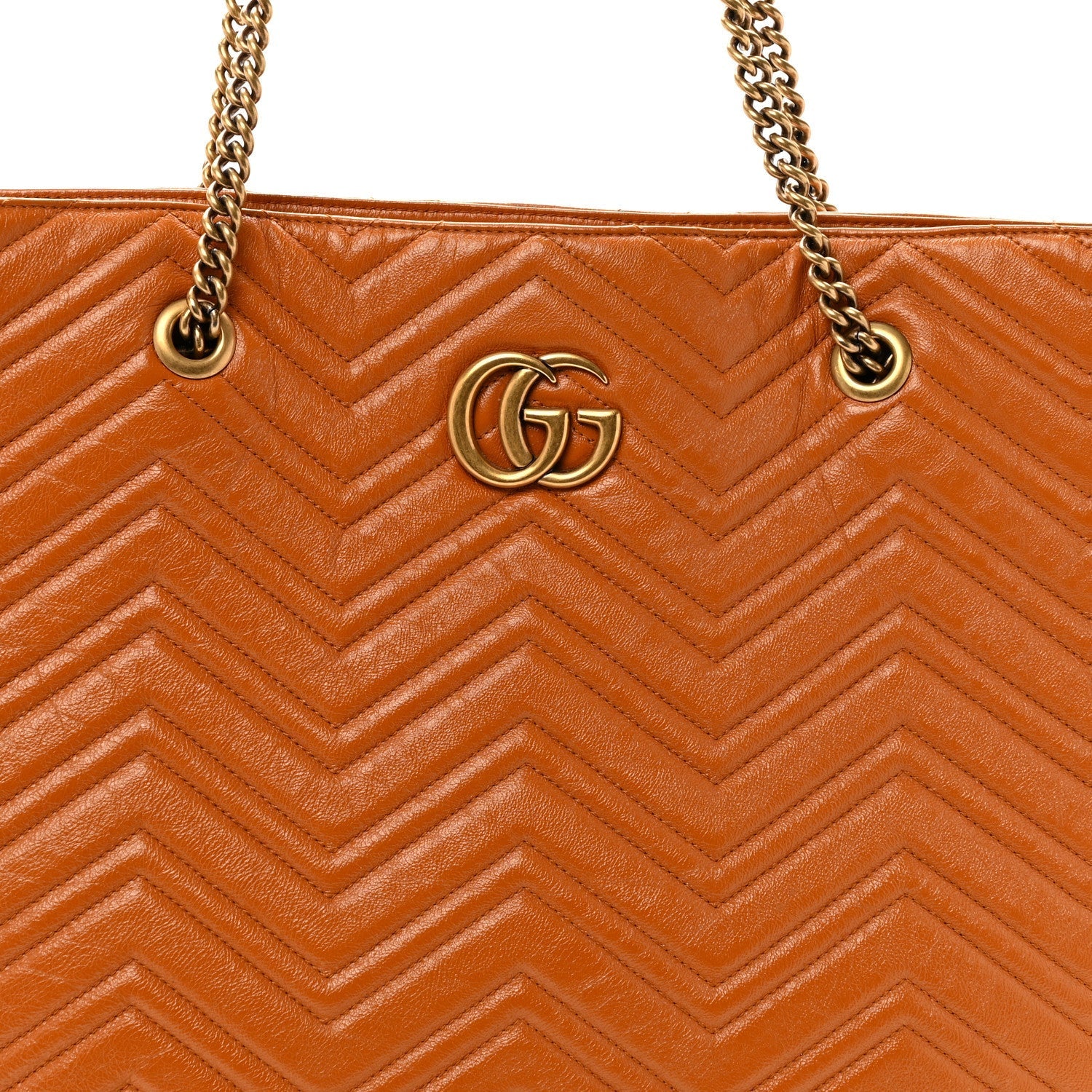 This is an authentic GUCCI Azalea Calfskin Matelasse Large GG Marmont Slim Tote in Cognac. This shoulder bag is crafted of textured calfskin leather in orange. This bag features aged-gold chain shoulder straps with leather shoulder pads and an interlocking aged gold GG on the front panel. The top zipper opens to beige suede interior with zipper and patch pockets.