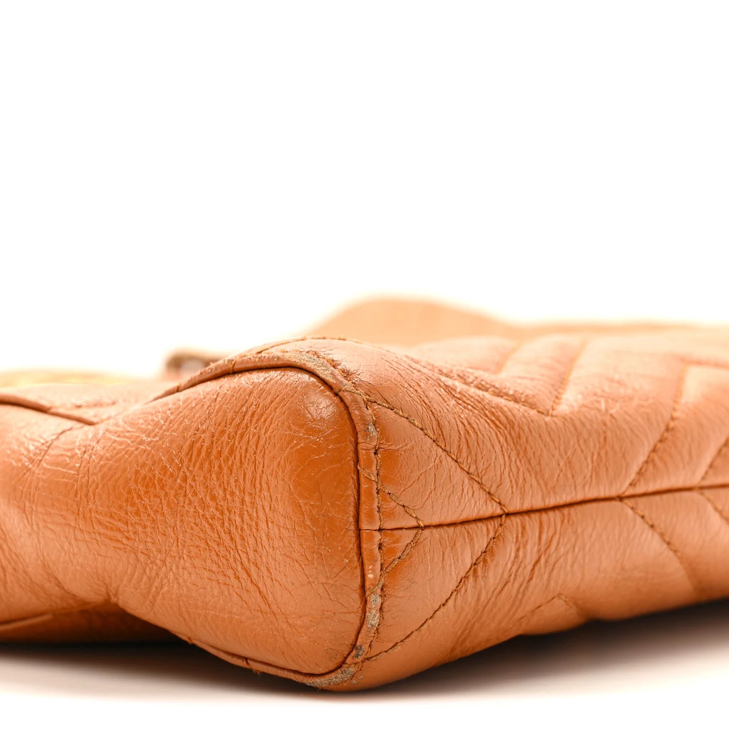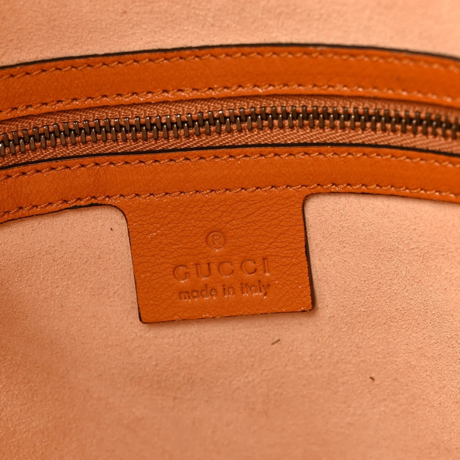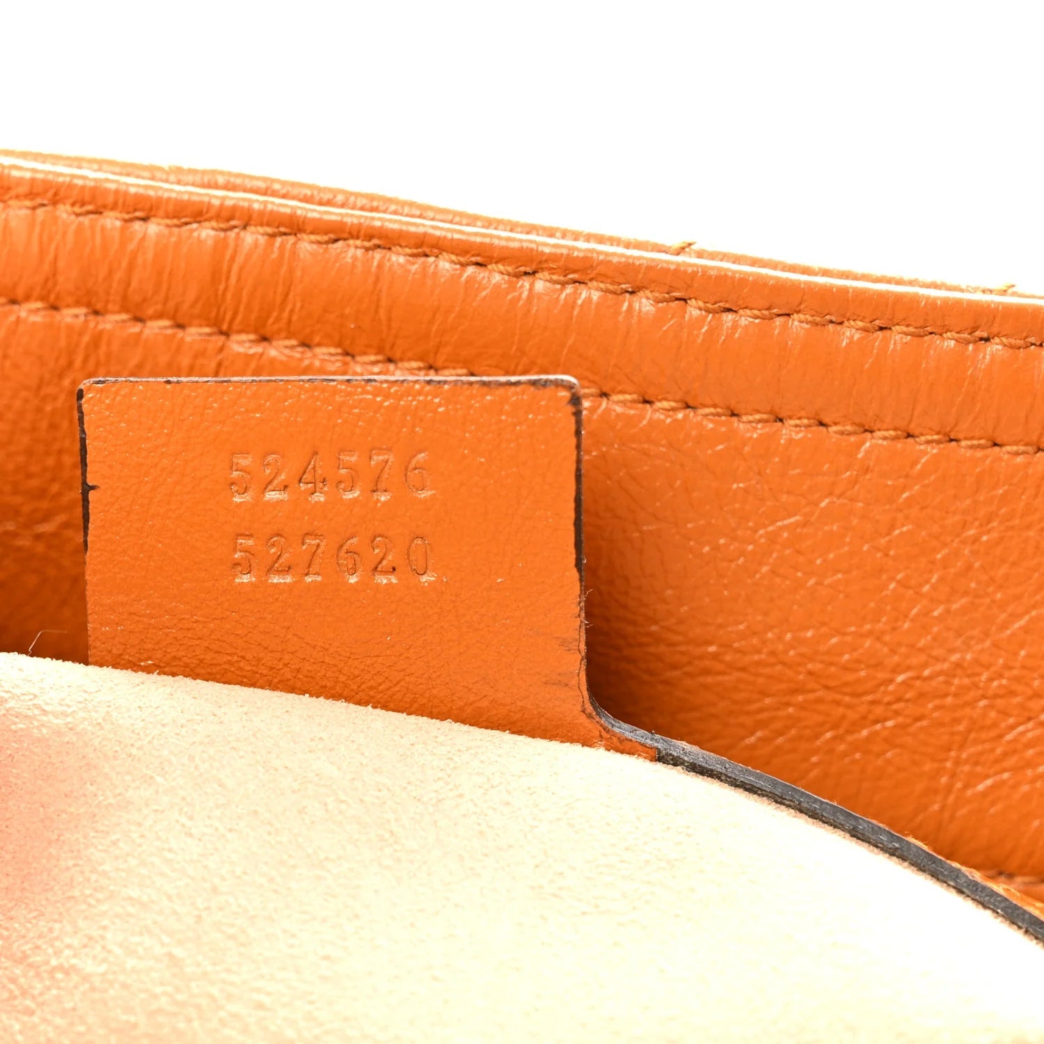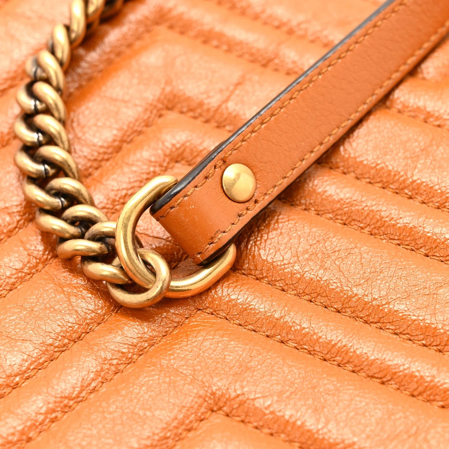 This is an authentic GUCCI Azalea Calfskin Matelasse Large GG Marmont Slim Tote in Cognac. This shoulder bag is crafted of textured calfskin leather in orange. This bag features aged-gold chain shoulder straps with leather shoulder pads and an interlocking aged gold GG on the front panel. The top zipper opens to beige suede interior with zipper and patch pockets.
