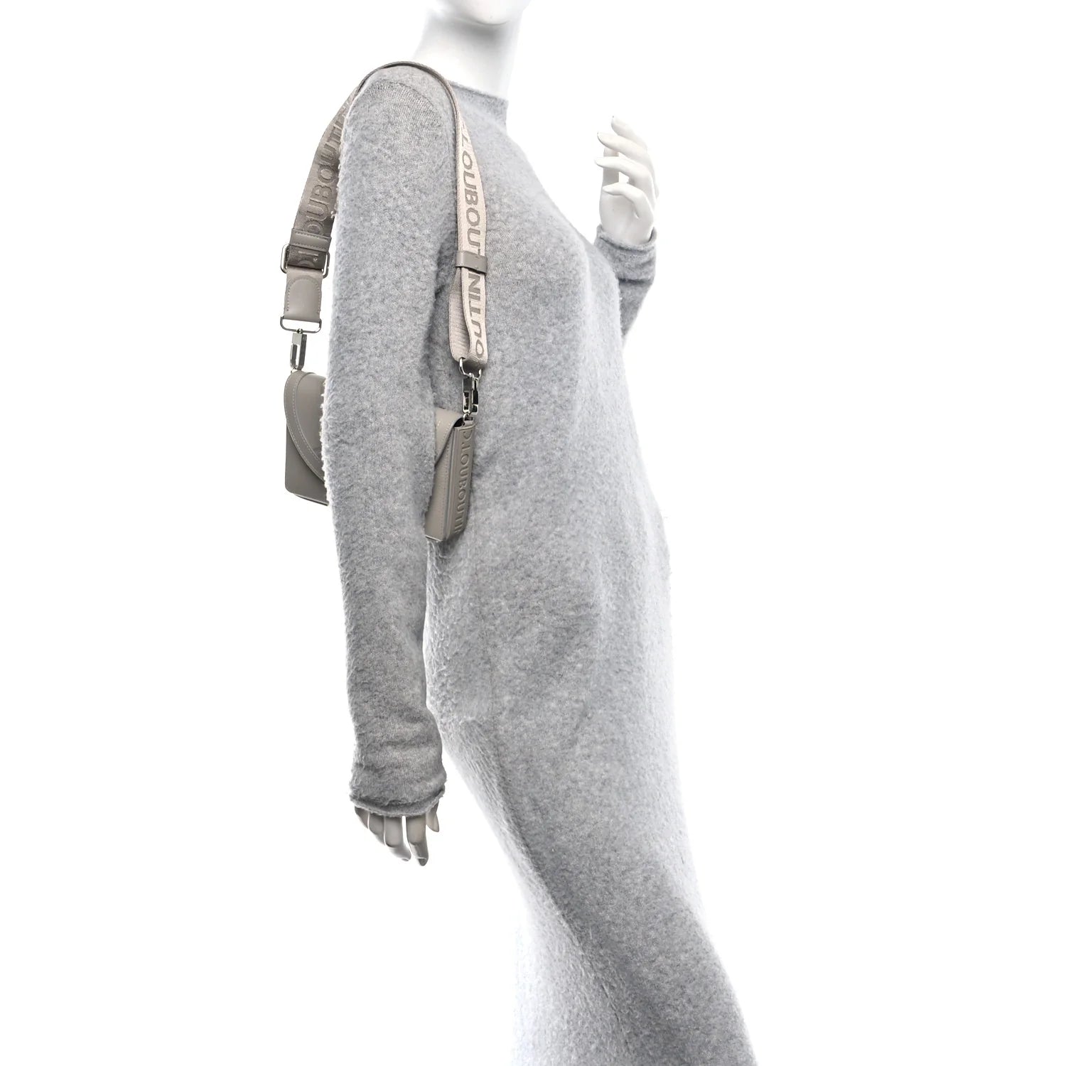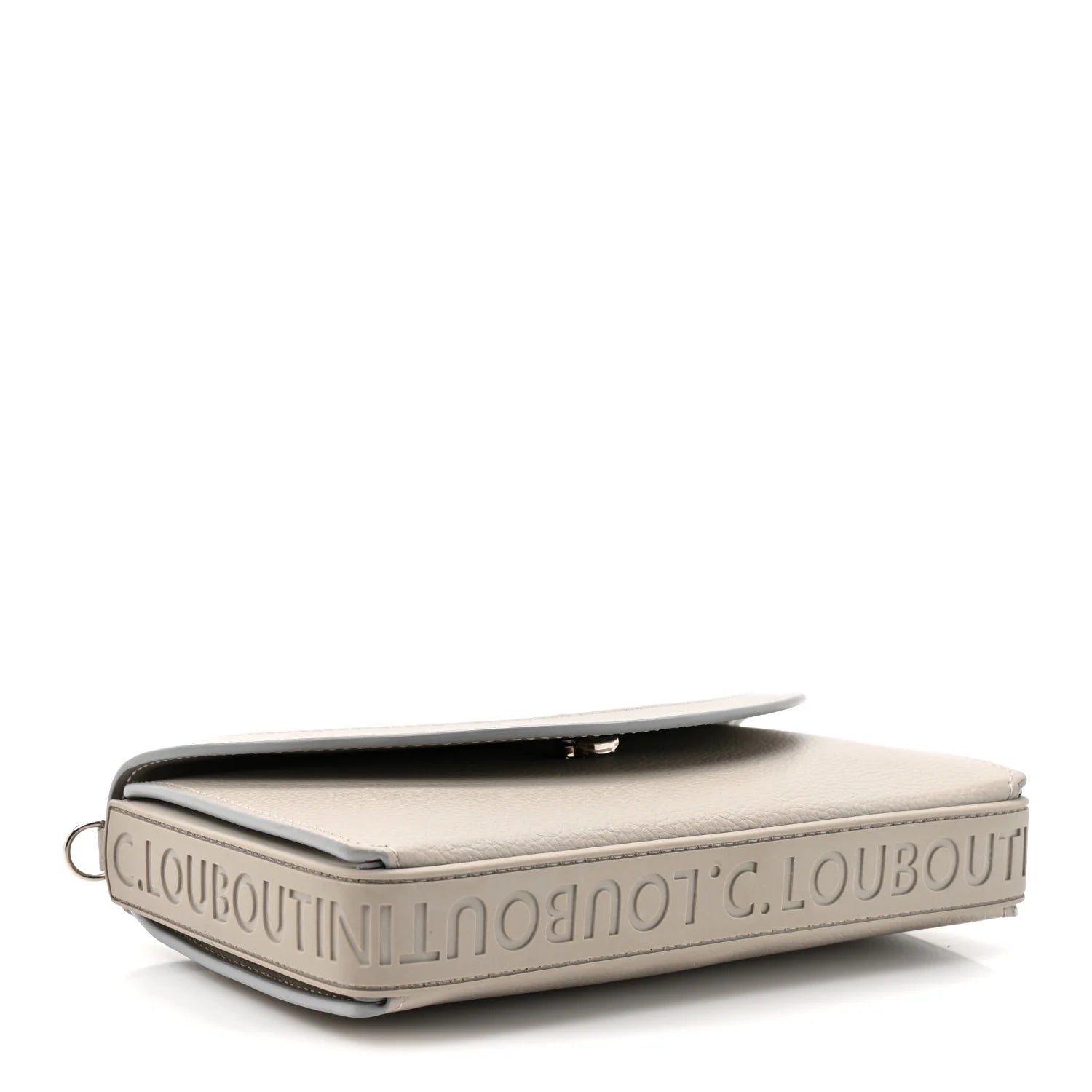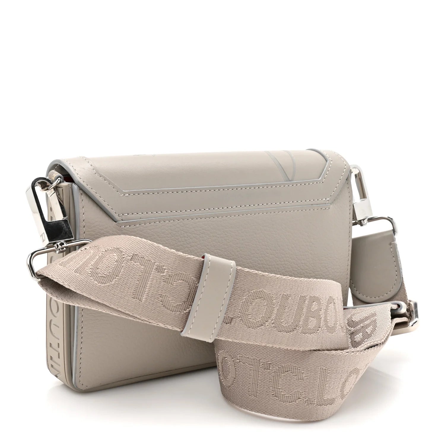 This is an authentic CHRISTIAN LOUBOUTIN Calfskin Explorafunk Wallet On Strap on Goose. This wallet is crafted of grained calfskin leather in grey with a smooth, logo embossed crossover flap and rubber logo embossed trim. The bag features a removable adjustable canvas logo strap and opens with a magnetic snap to a parititoned red leather interior with card slots, a patch pocket, and zippered compartment.