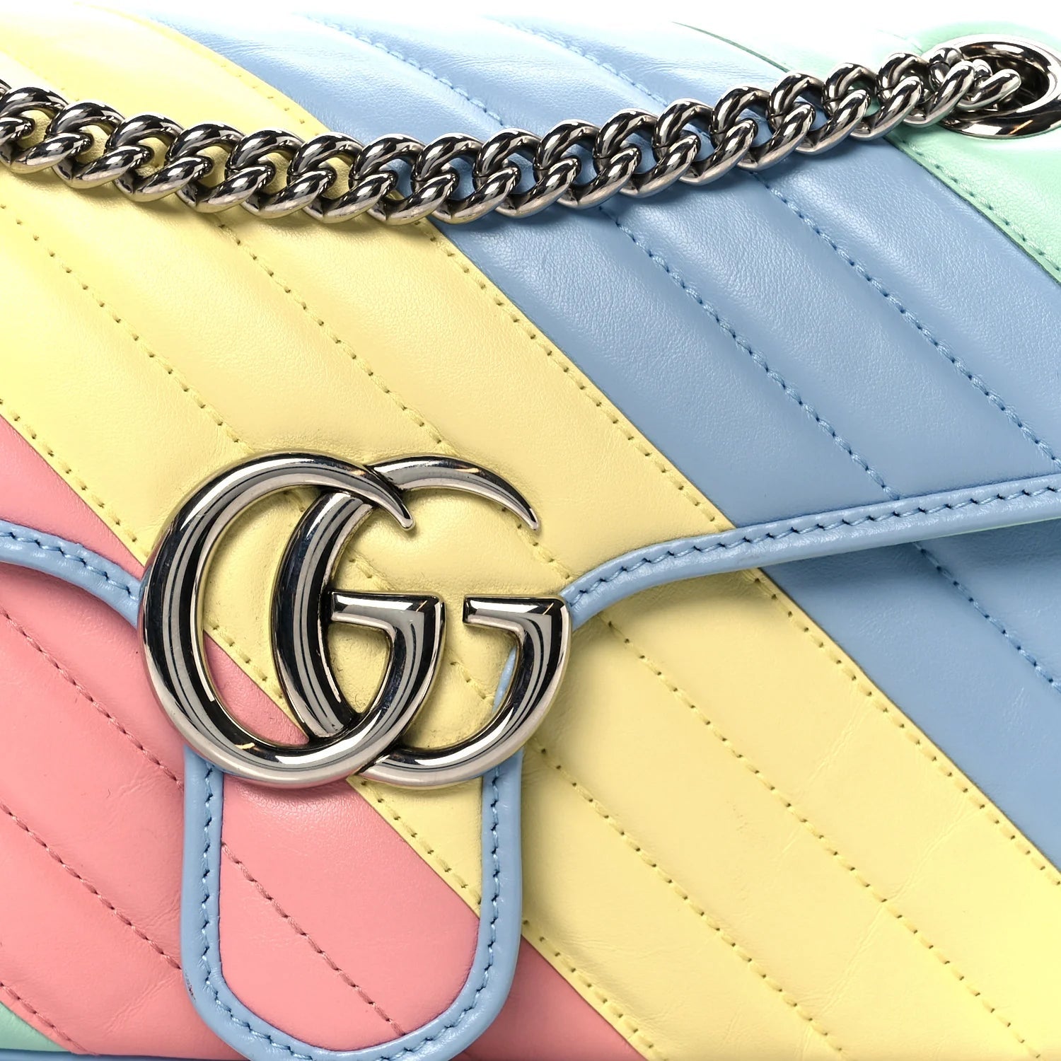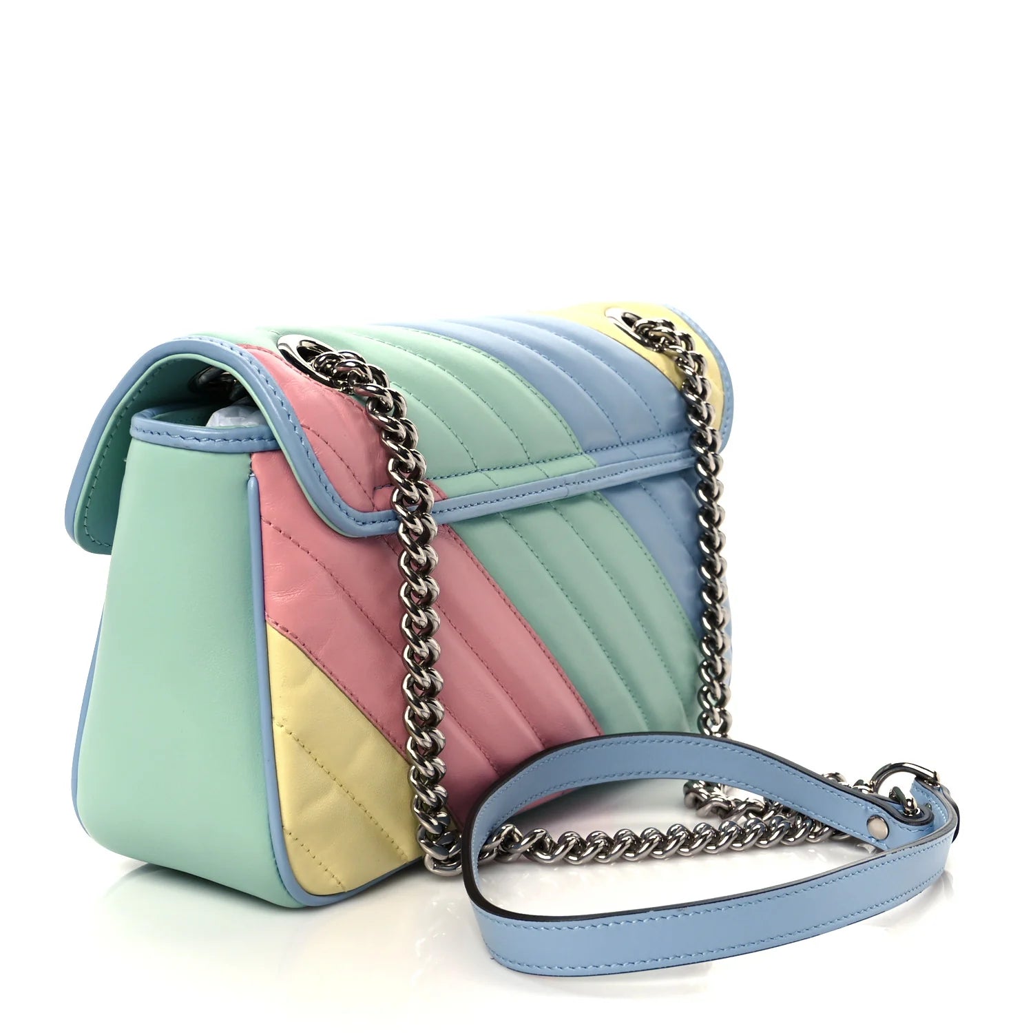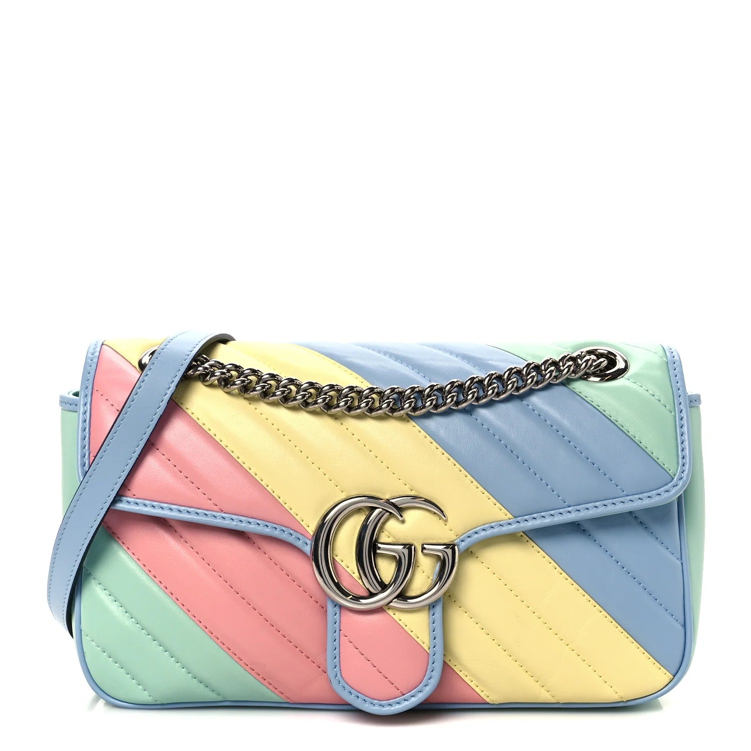 This is an authentic GUCCI Calfskin Matelasse Diagonal Small GG Marmont Shoulder Bag in Multicolor and Pastel. This shoulder bag is crafted of smooth and supple calfskin leather in pastel green, pink, yellow, and blue. This bag features a long silver chain shoulder strap with a pastel blue leather pad. The front crossover flap features an interlocking silver GG logo push lock that opens to a beige microfiber interior with a zipper pocket.