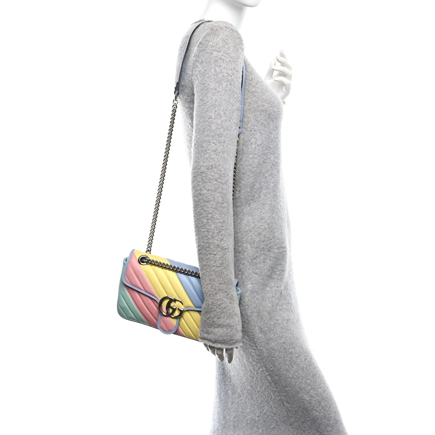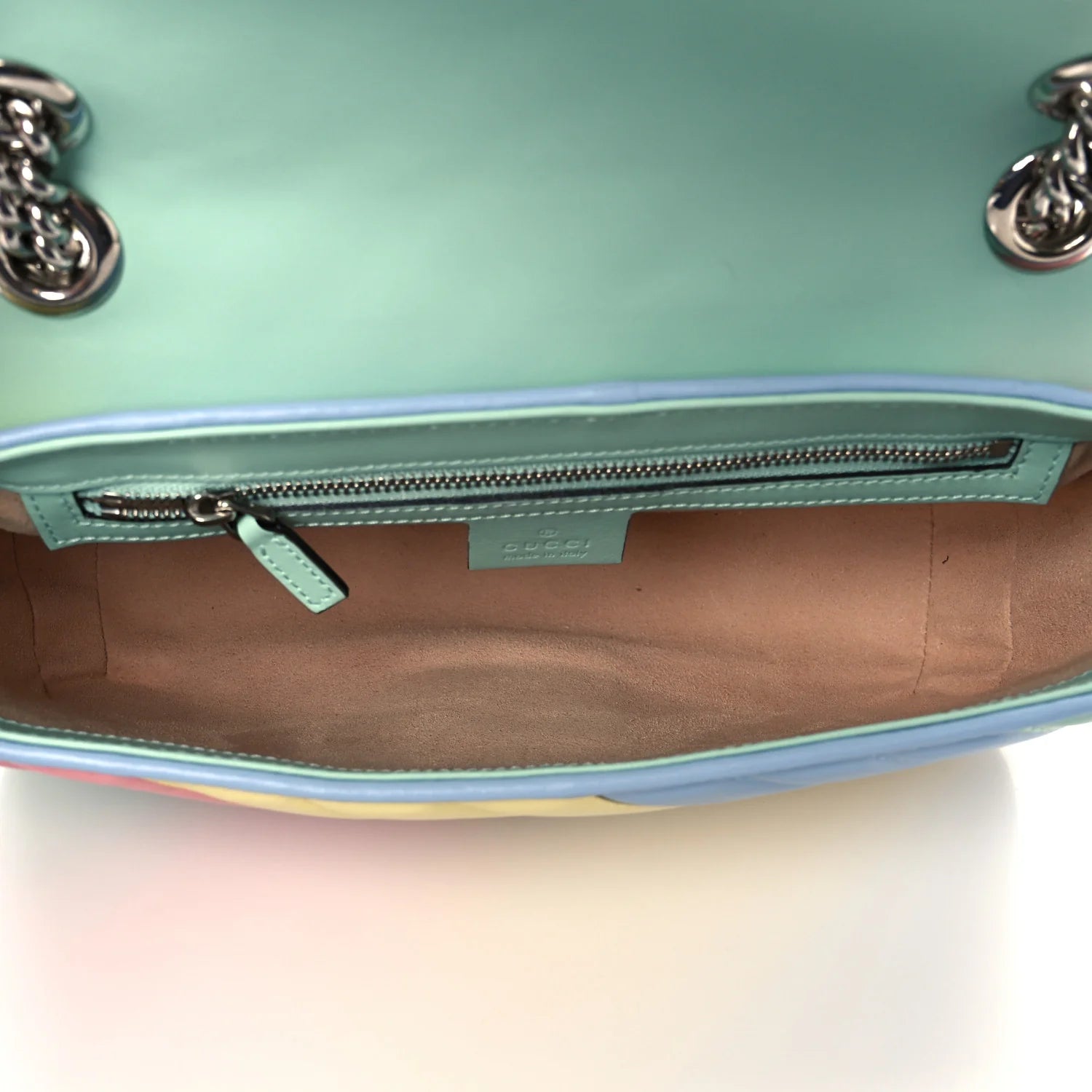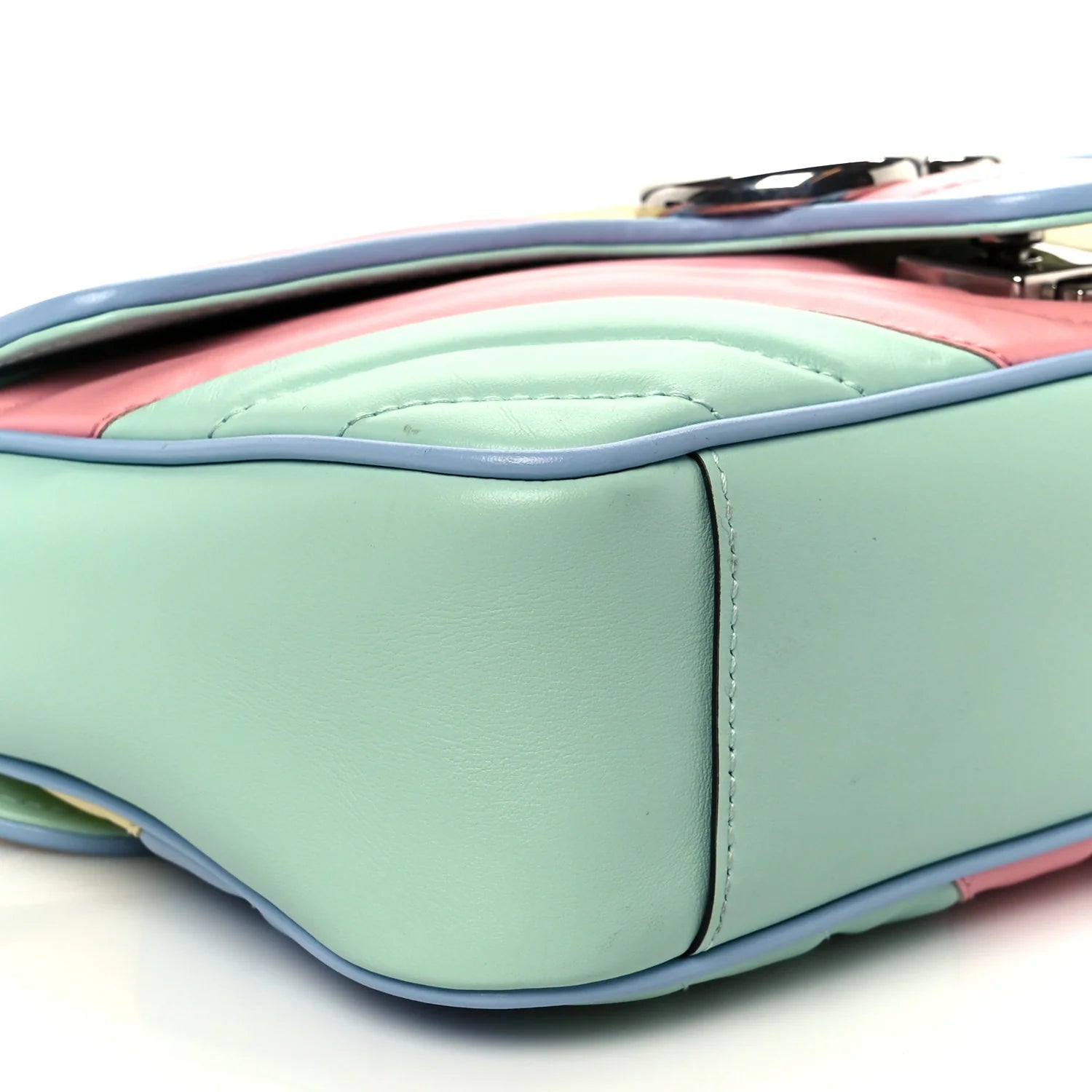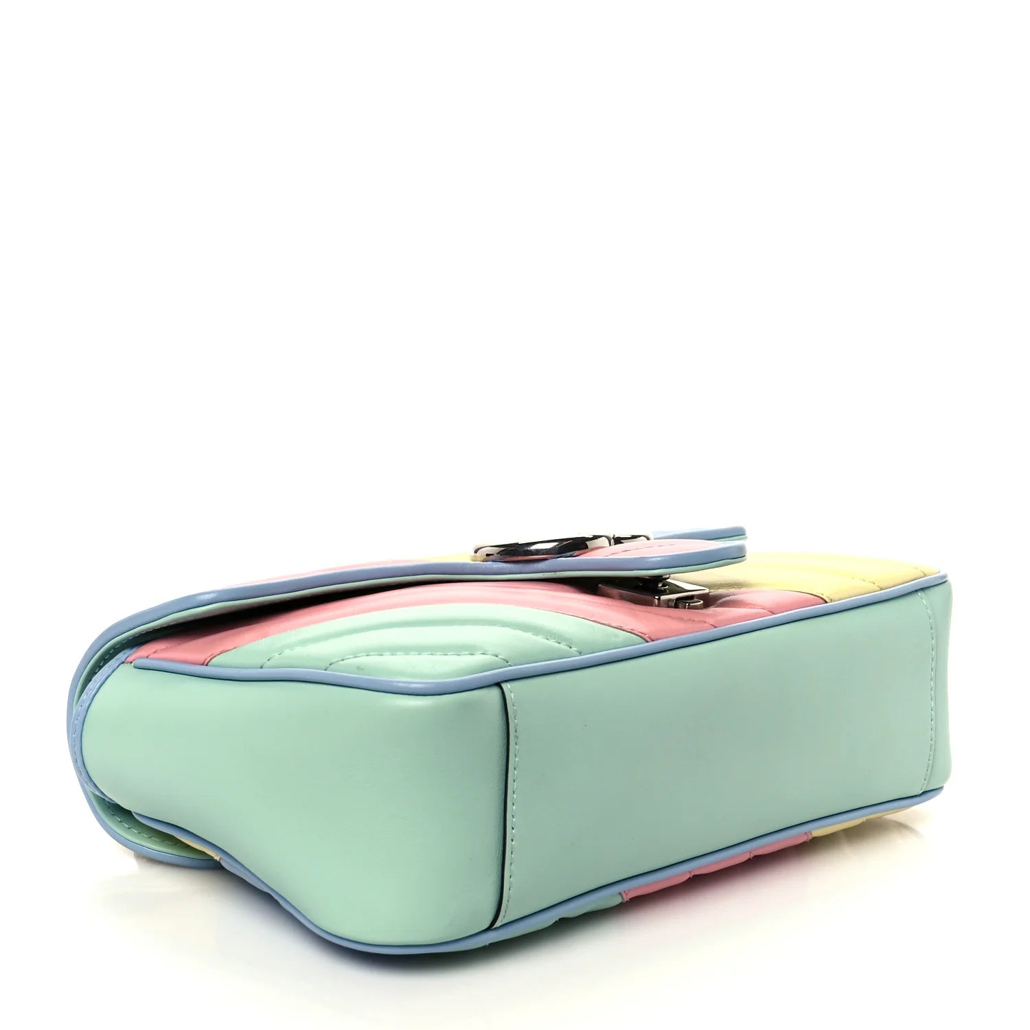 This is an authentic GUCCI Calfskin Matelasse Diagonal Small GG Marmont Shoulder Bag in Multicolor and Pastel. This shoulder bag is crafted of smooth and supple calfskin leather in pastel green, pink, yellow, and blue. This bag features a long silver chain shoulder strap with a pastel blue leather pad. The front crossover flap features an interlocking silver GG logo push lock that opens to a beige microfiber interior with a zipper pocket.