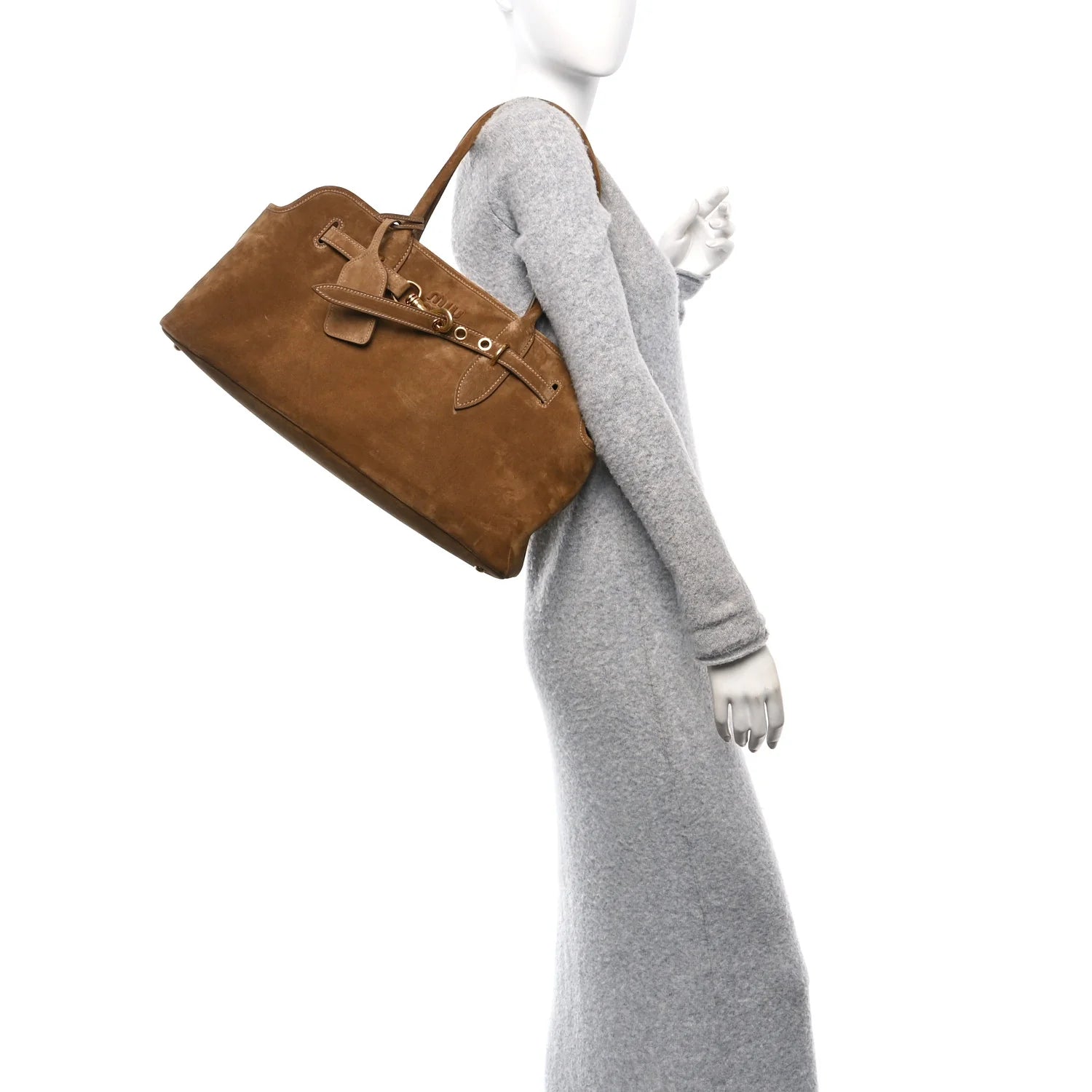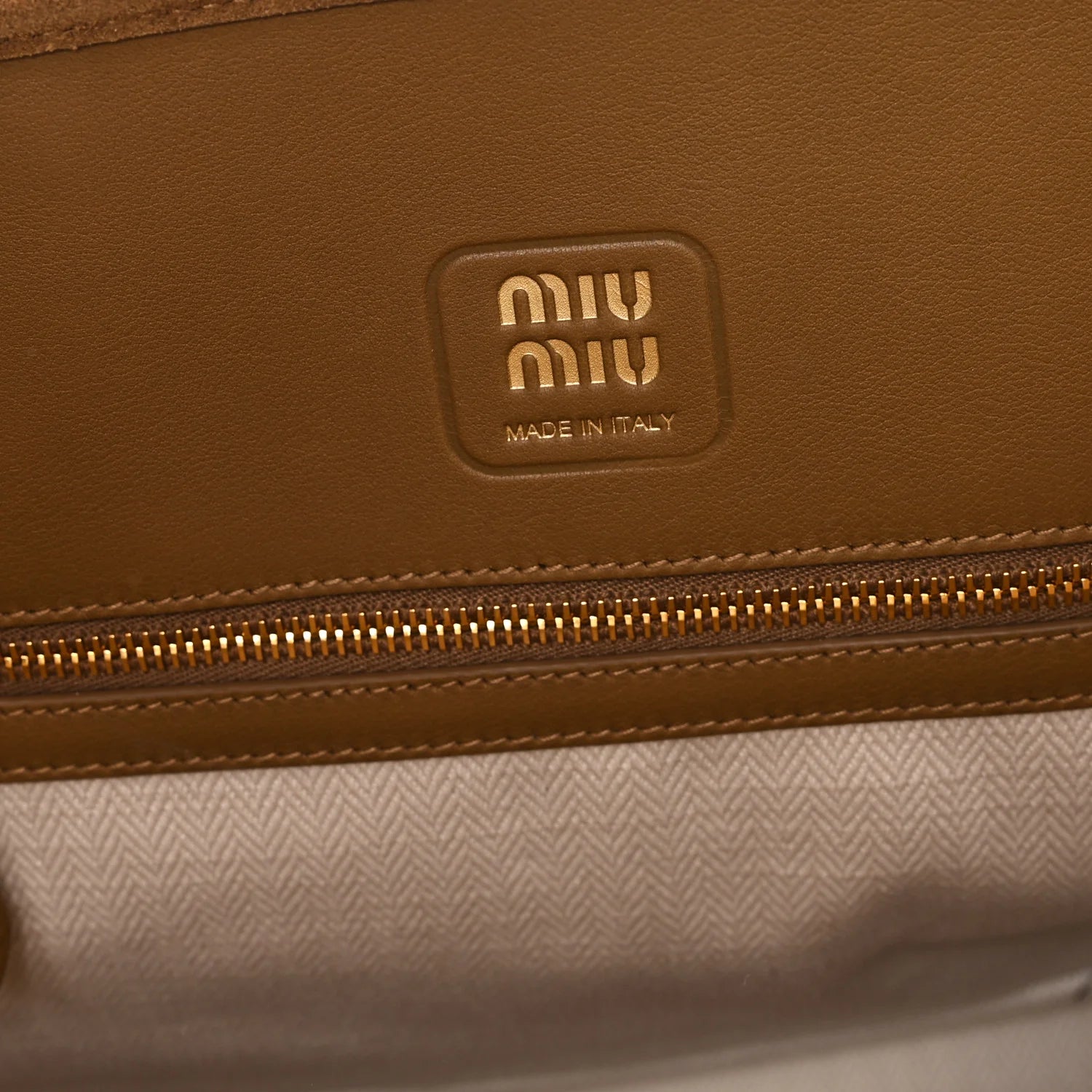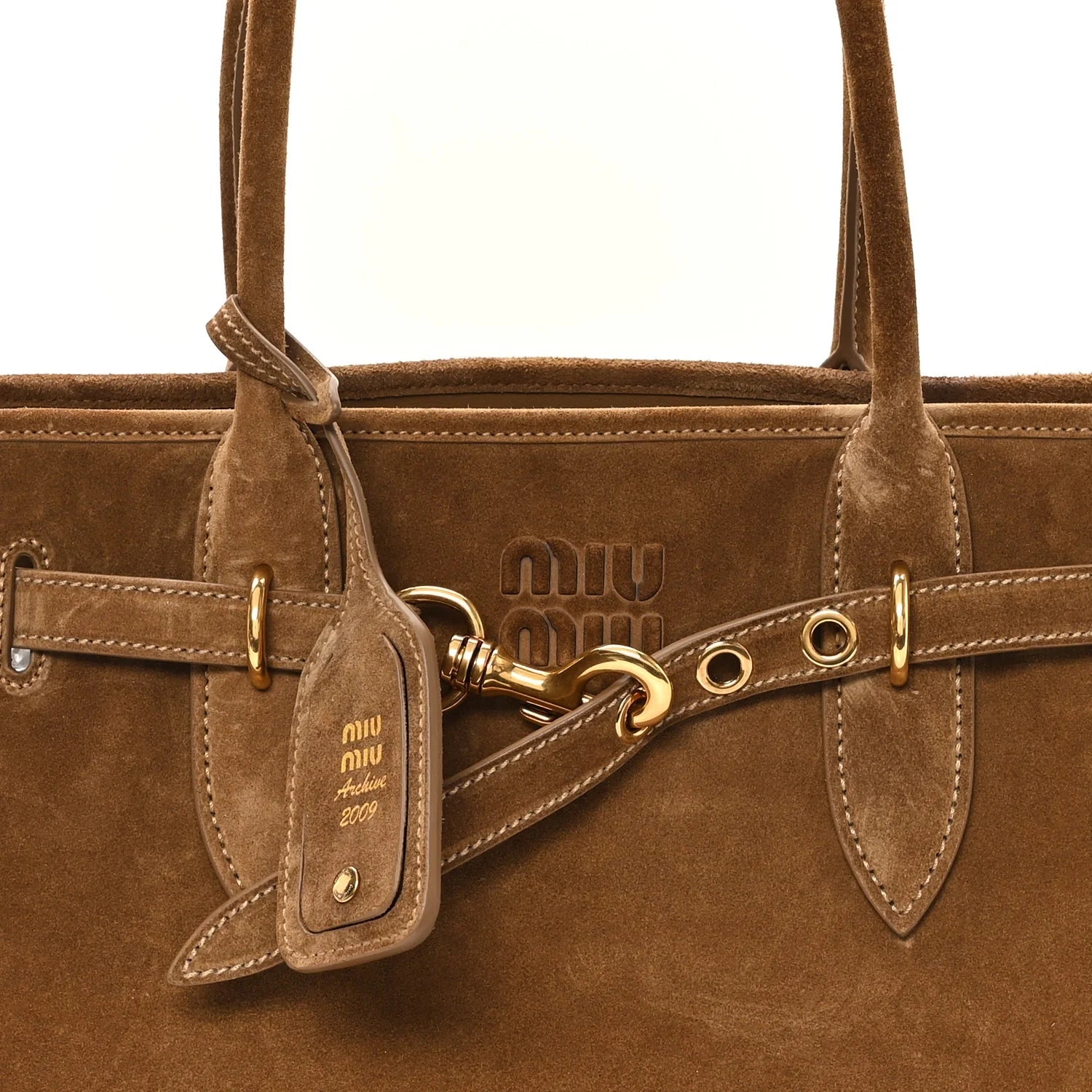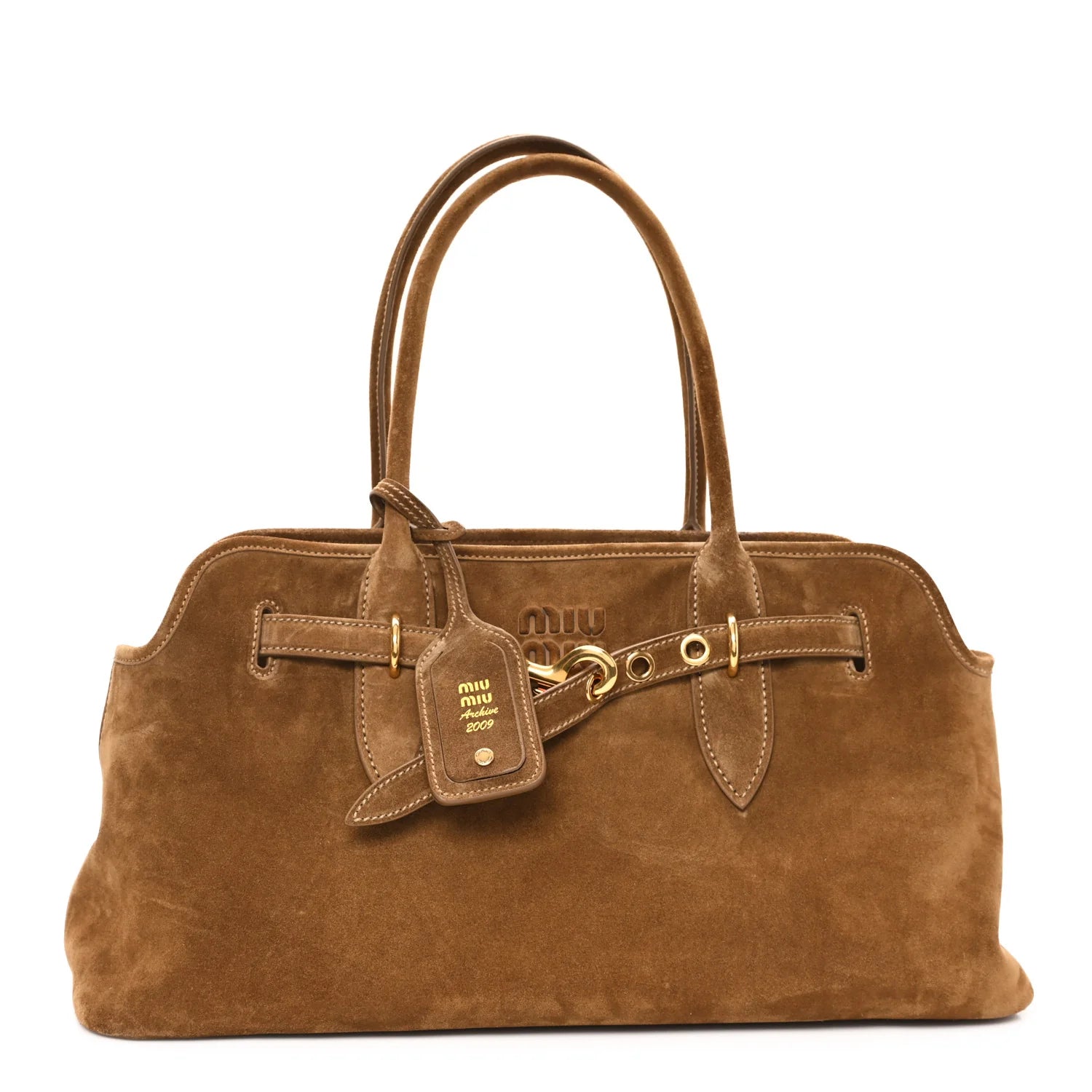 This is an authentic MIU MIU Camoscio Large Aventure Bag in Olive Green. This stylish bag is inspired by the iconic style of 2009, crafted of olive green suede leather. The bag features rolled shoulder straps, a top cinching strap with aged gold clasps, and an embossed Miu Miu logo. The top opens to a beige fabric interior with a zipper pocket and leather patch pockets.