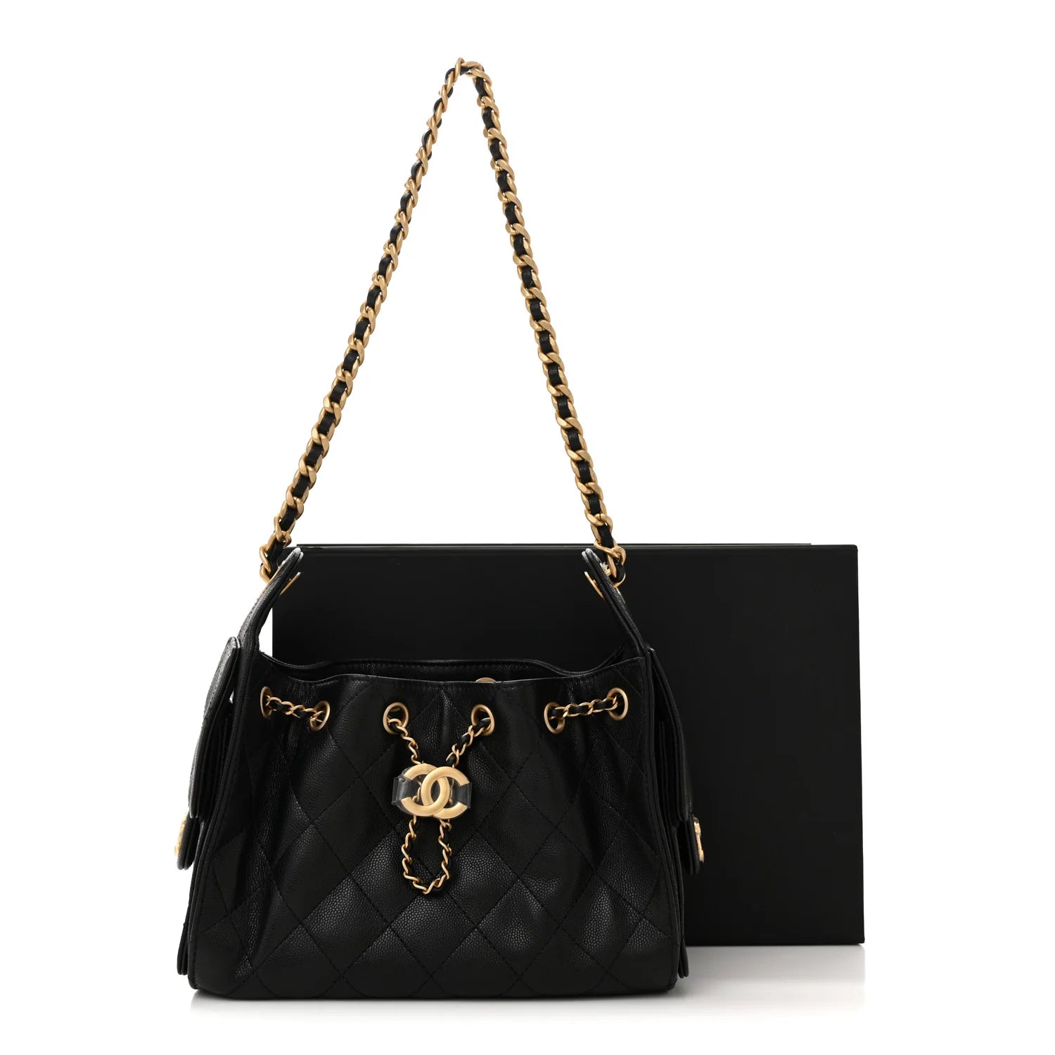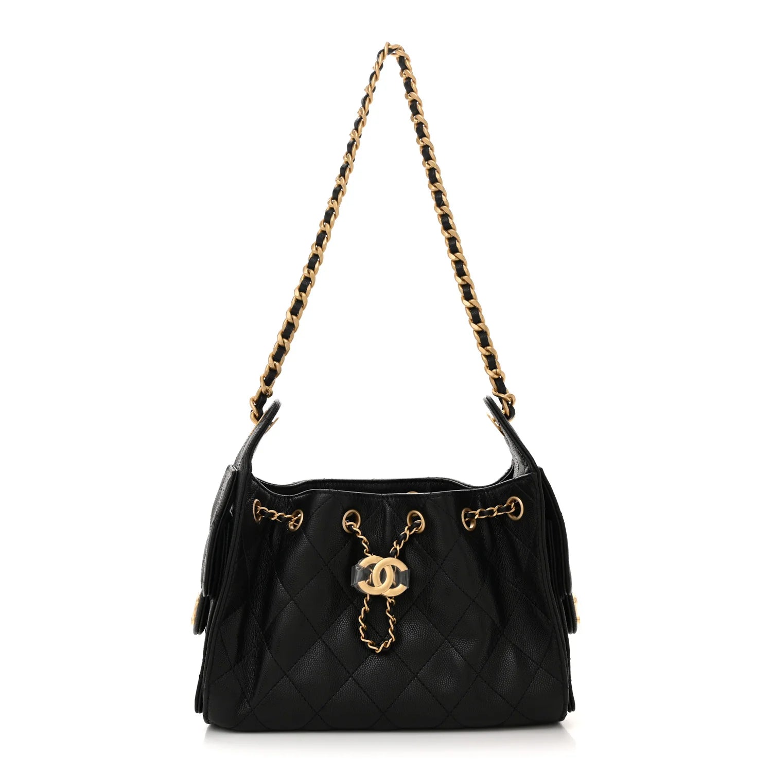 This is an authentic CHANEL Caviar Quilted Mini Chanel 25 Handbag in Black. This chic shoulder bag is crafted of caviar calfskin leather in black. It features a gold chain leather shoulder strap, two side pockets, and gold hardware. The top opens to a black fabric interior with a patch pocket.