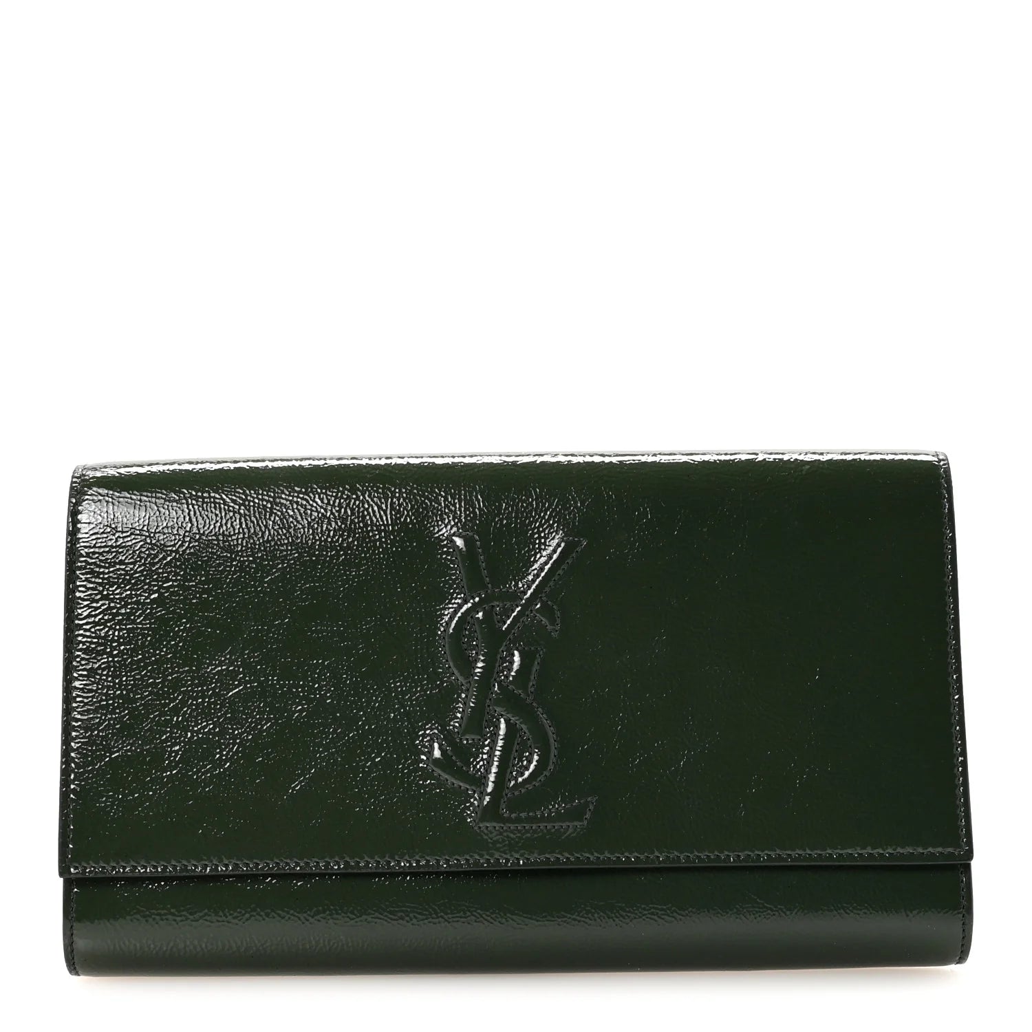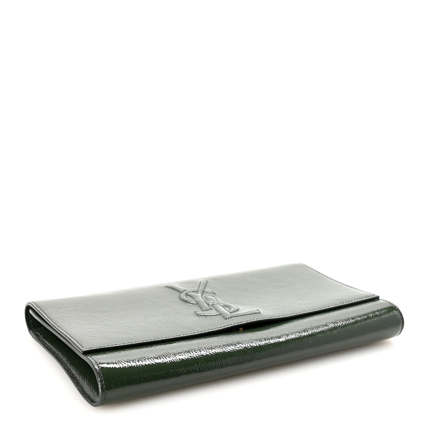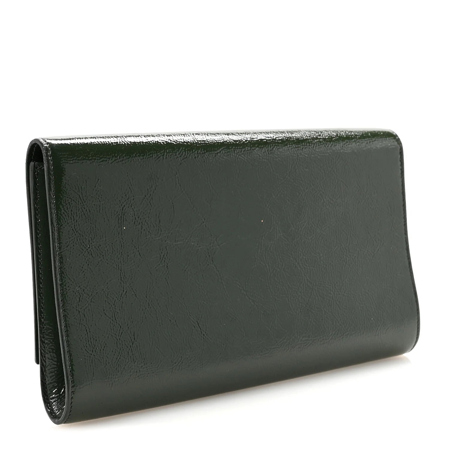 This is an authentic SAINT LAURENT Distressed Patent Small Belle De Jour Clutch in Tartan Green. This lovely clutch is crafted of stunning textured high-gloss patent leather. There is a classic embossed YSL logo on the front flap that opens to a black satin interior.