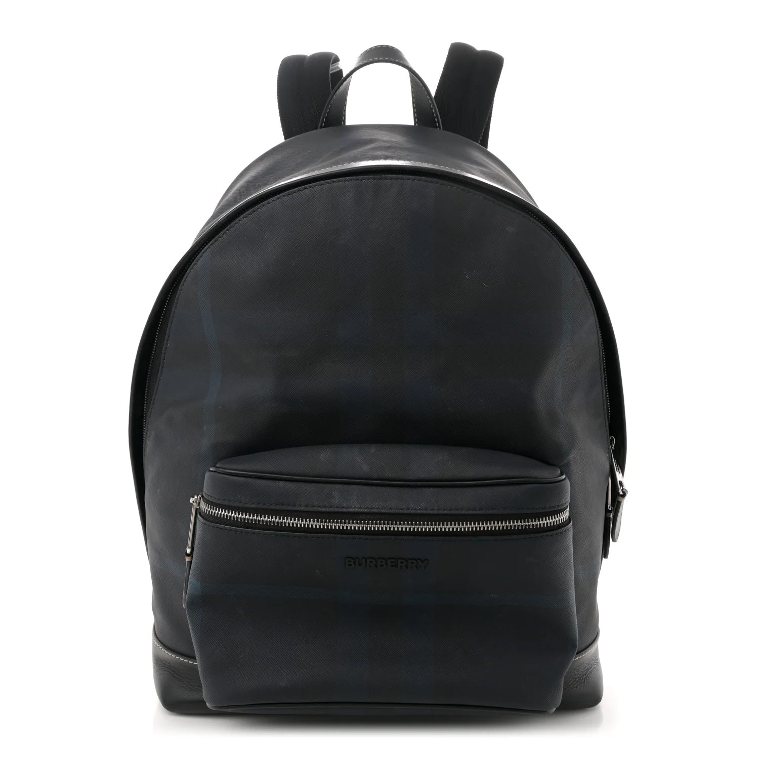 This is an authentic BURBERRY E-Canvas Check Jett Backpack in Navy Blue. This chic backpack is crafted of coated canvas in vintage check print, with black leather trim, and black leather base trim. The bag features a strap top handle, adjustable shoulder straps, a front zipper pocket, and polished silver hardware. The wrap-around zippers open to a fabric interior with a zipper pocket, and a padded compartment, suitable for a laptop.