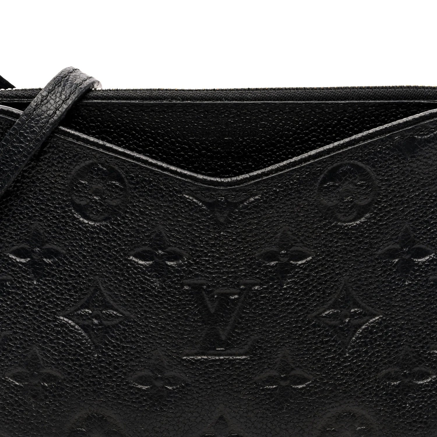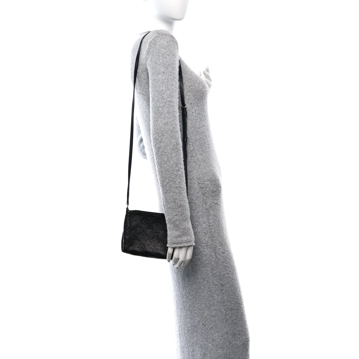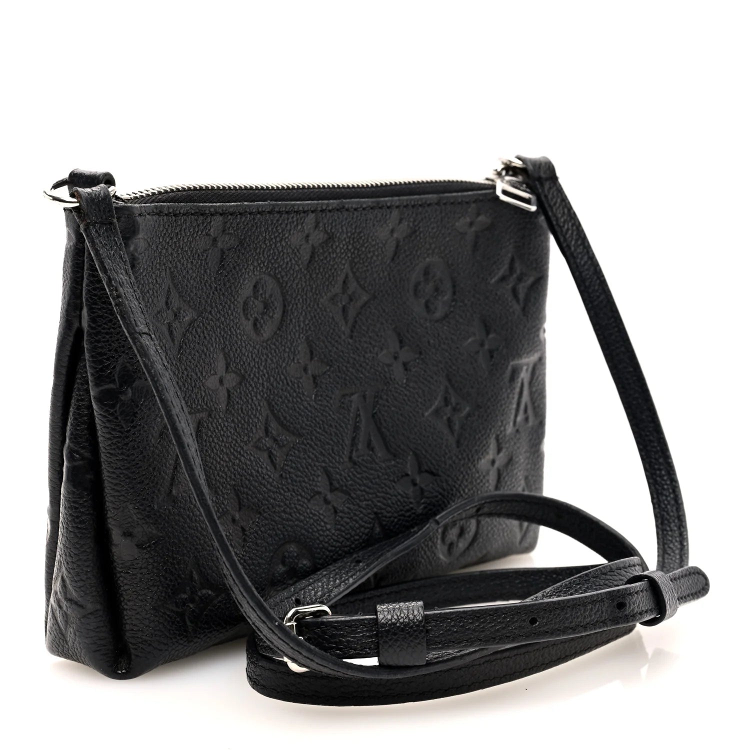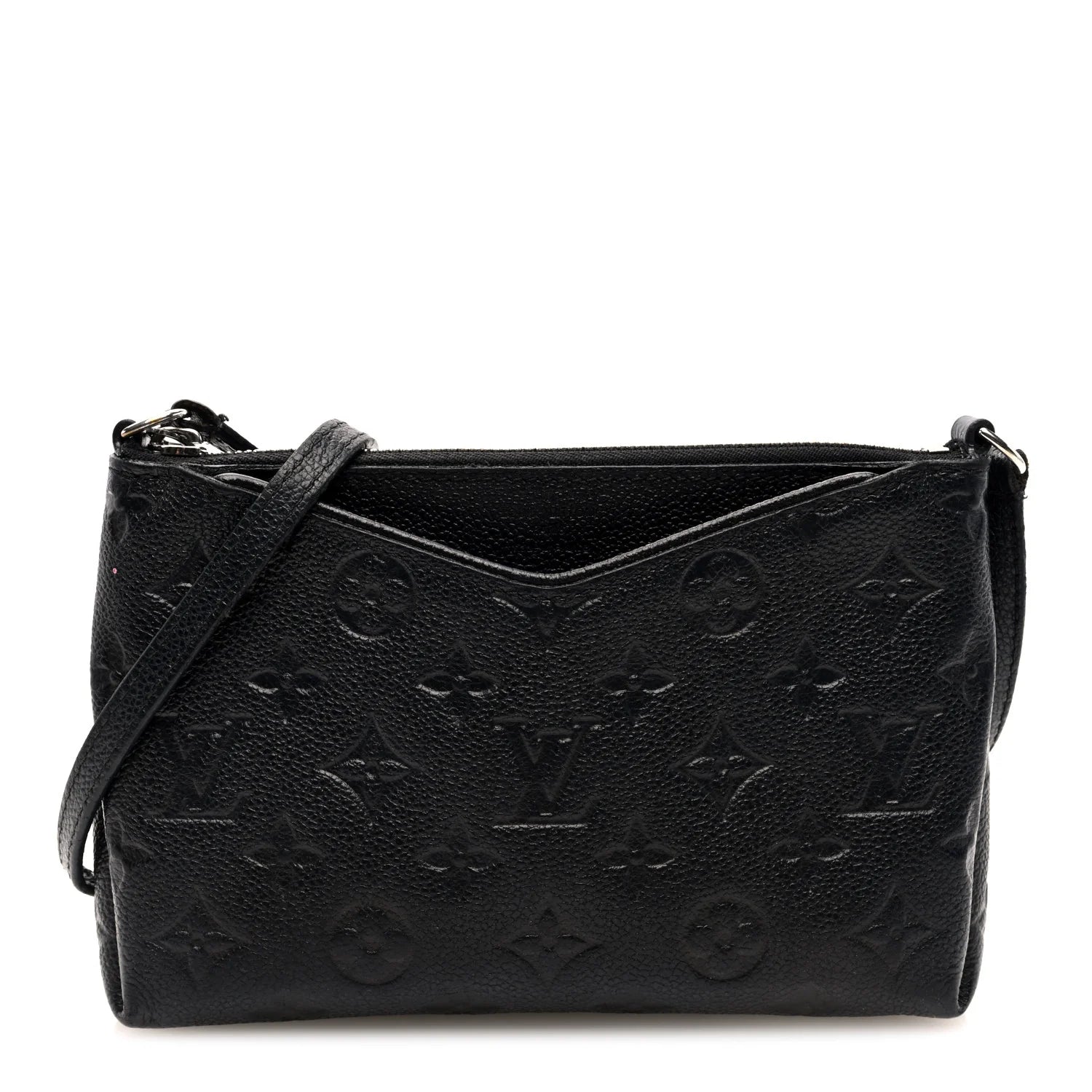 This is an authentic LOUIS VUITTON Empreinte Pallas Crossbody in Black. This chic shoulder bag is crafted of Louis Vuitton monogram embossed leather in black. This bag features an adjustable black strap with silver hardware and a front pocket. The top zipper opens to a black fabric interior with a patch pocket.