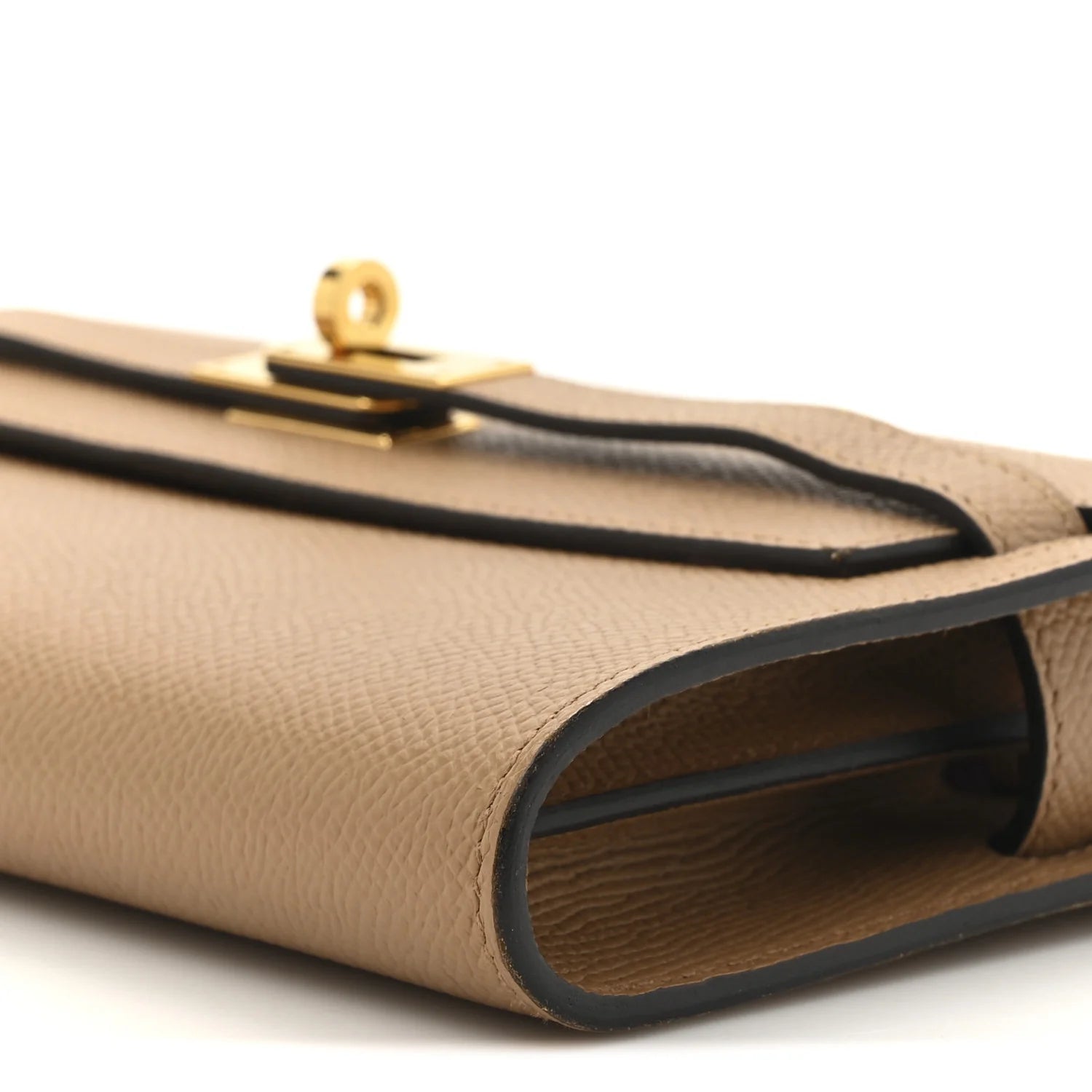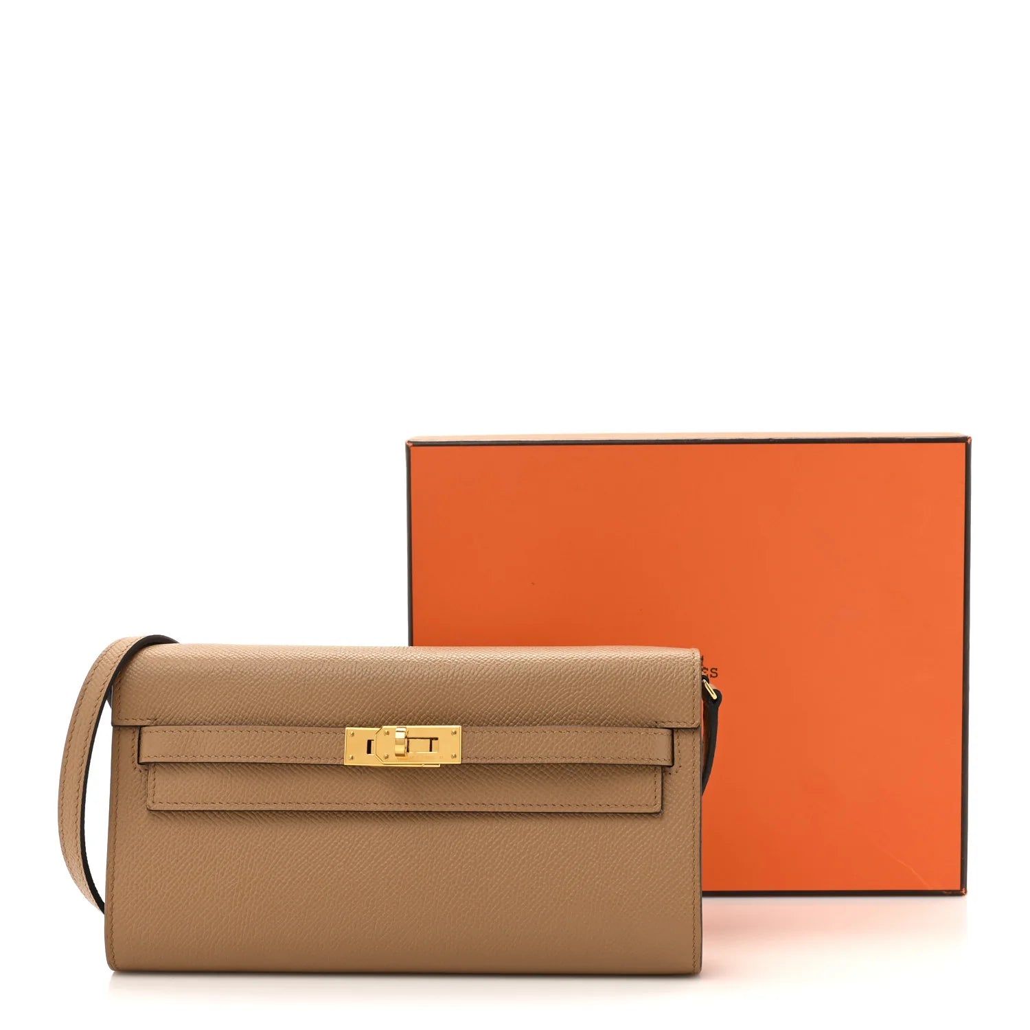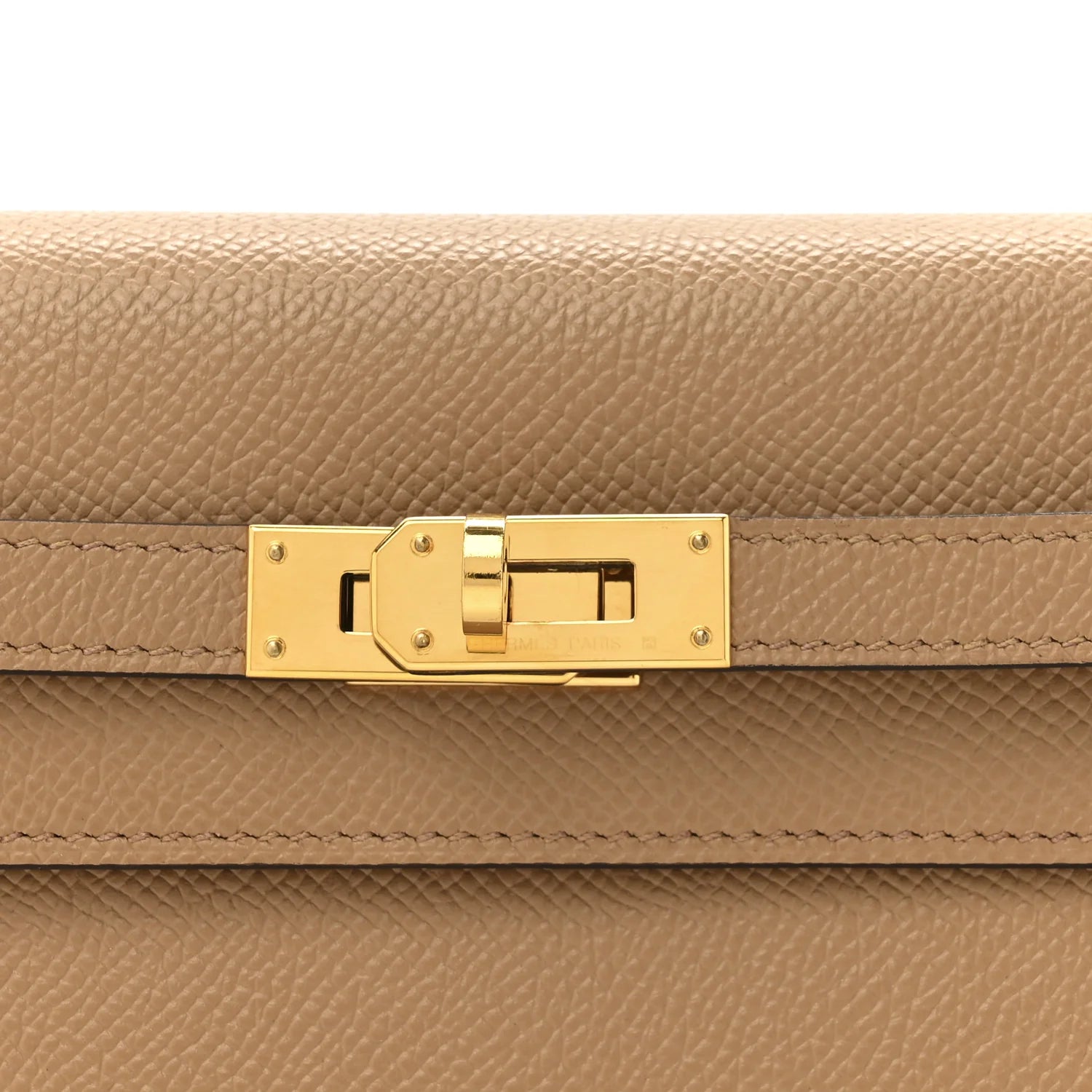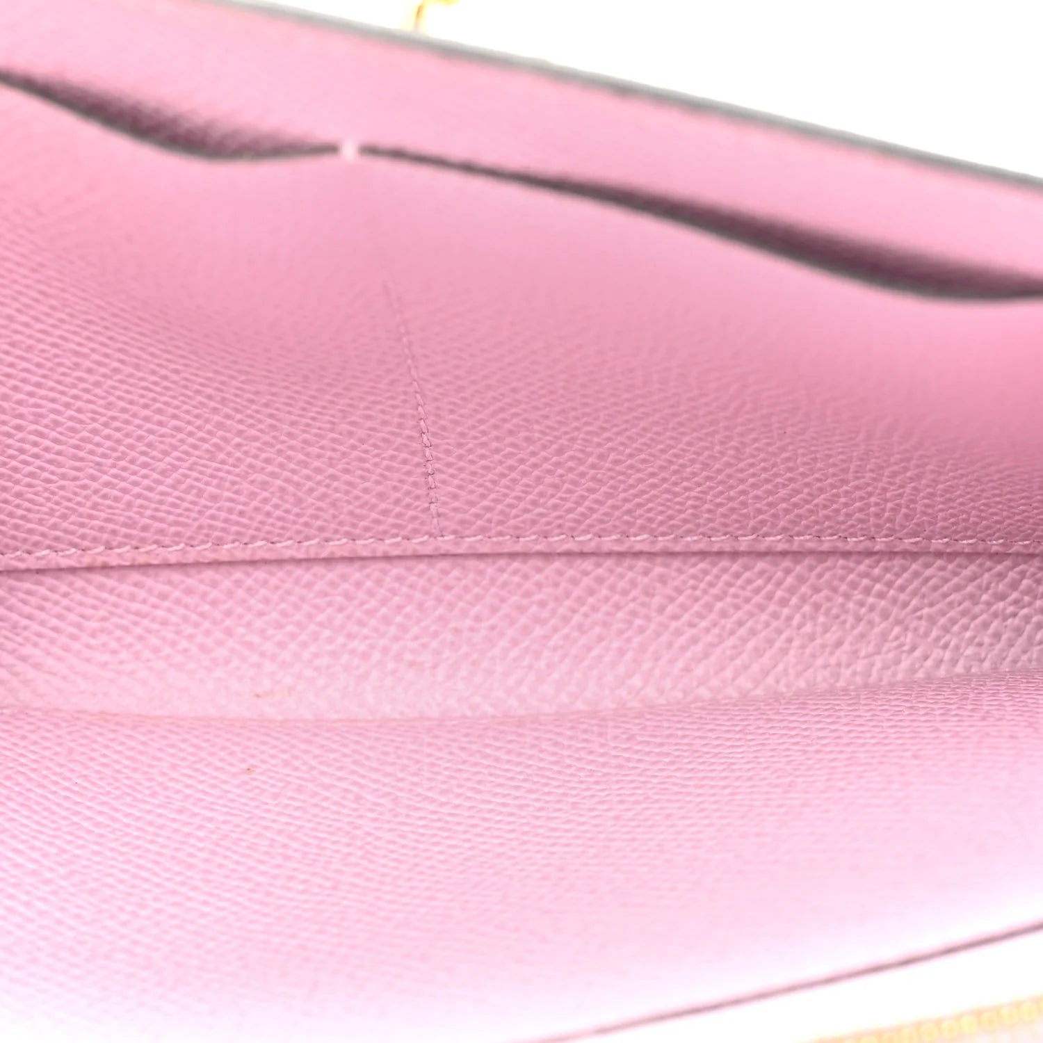 This is an authentic HERMES Epsom Kelly Wallet To Go in Chai and Mauve Sylvestre. This chic wallet is crafted of fine epsom stamped calfskin leather in light brown. The wallet features a front flap, strap, and signature Kelly gold plated turn-lock. This opens to a partitioned light pink leather interior with card slots, a detachable strap, and a zipper pocket.