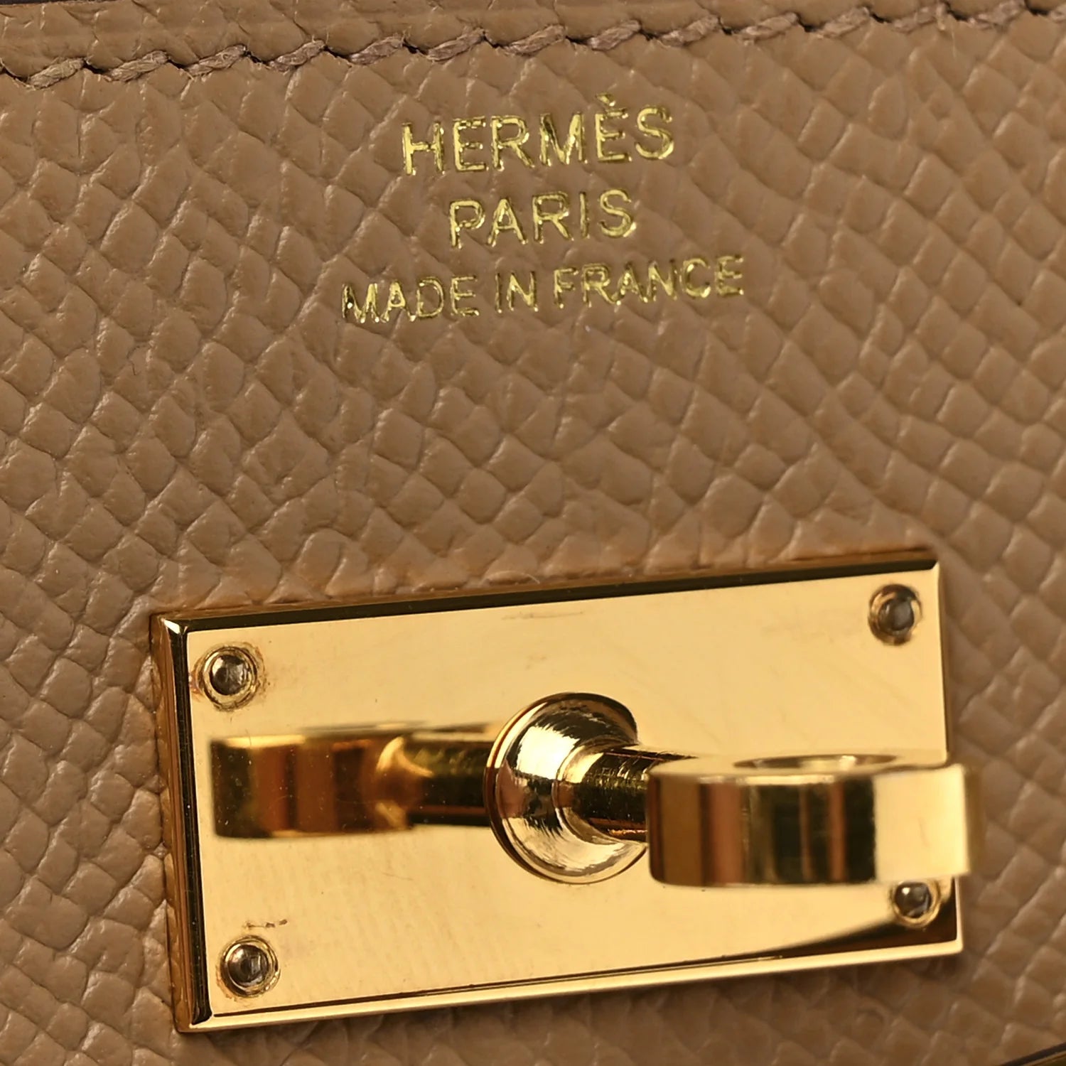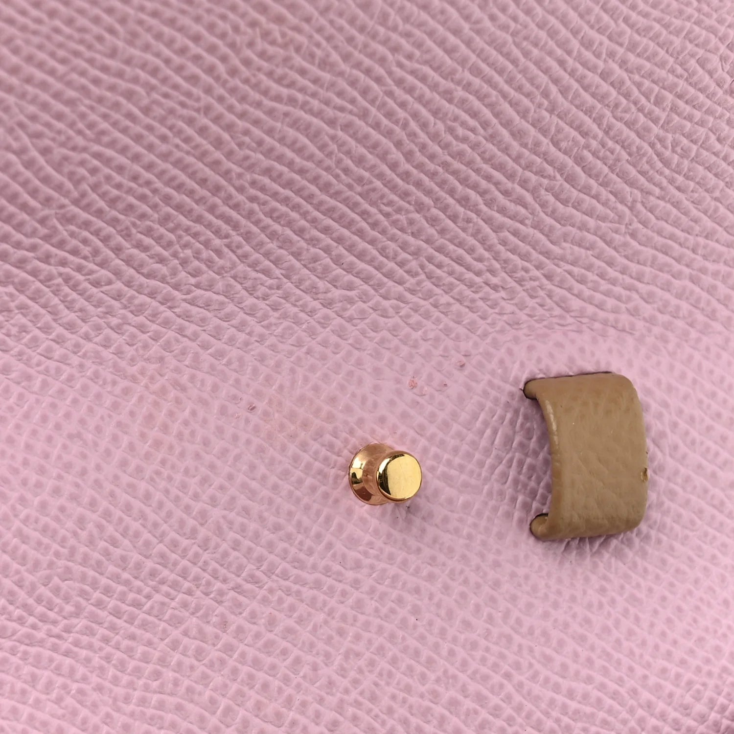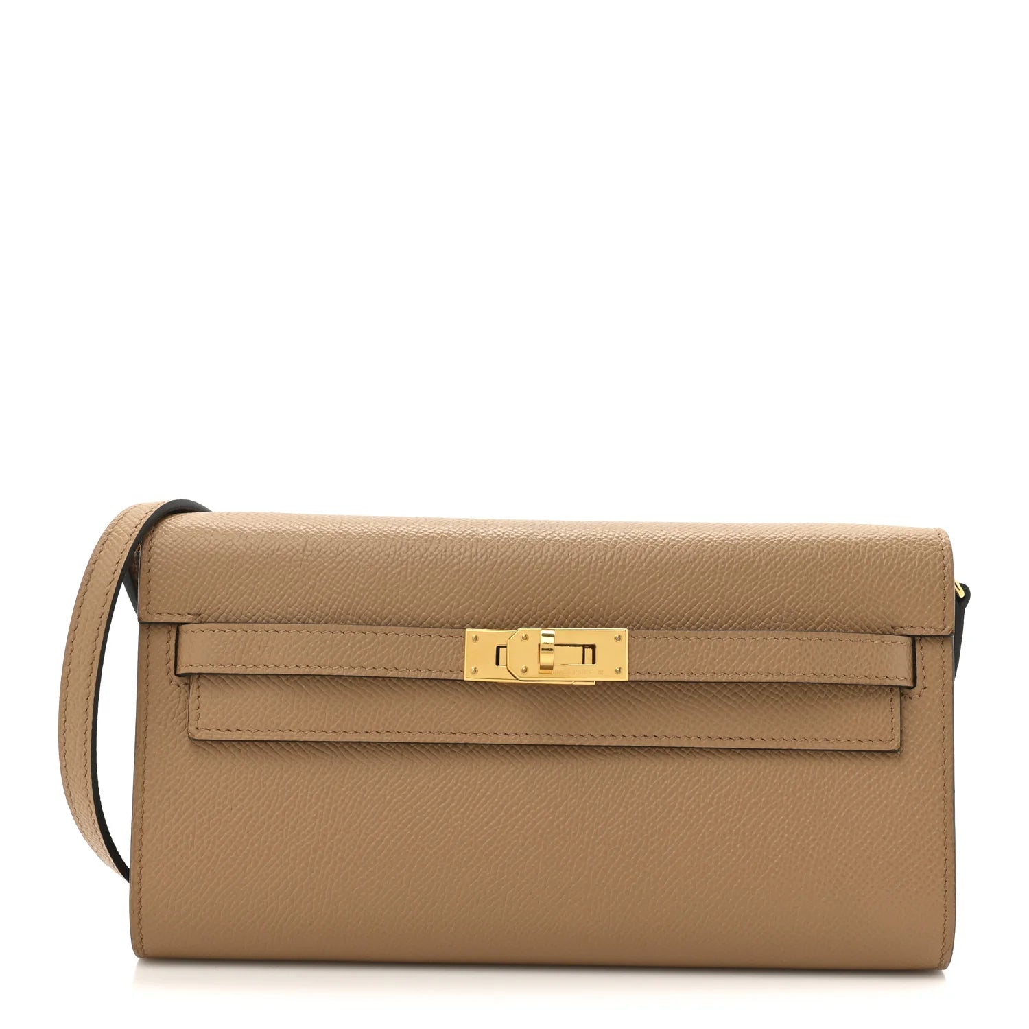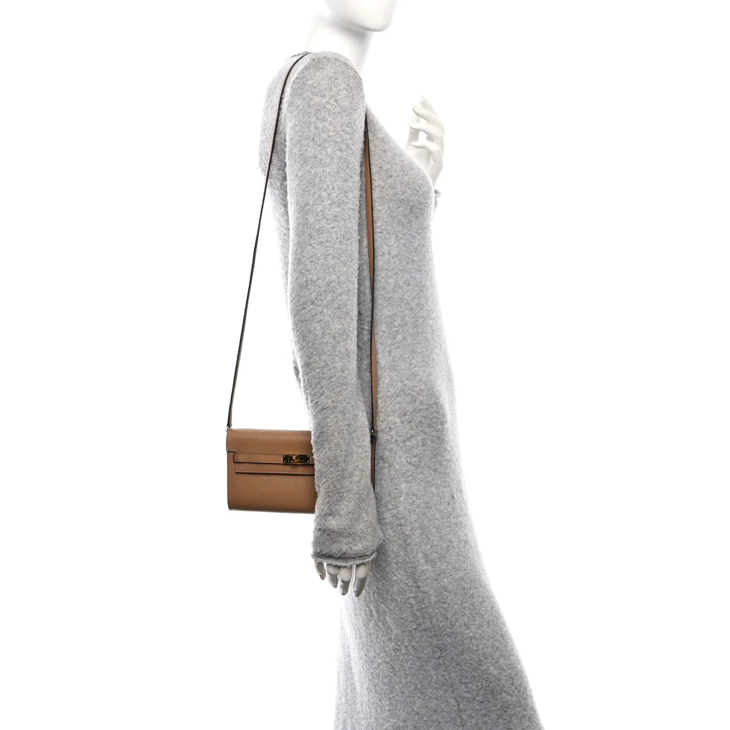 This is an authentic HERMES Epsom Kelly Wallet To Go in Chai and Mauve Sylvestre. This chic wallet is crafted of fine epsom stamped calfskin leather in light brown. The wallet features a front flap, strap, and signature Kelly gold plated turn-lock. This opens to a partitioned light pink leather interior with card slots, a detachable strap, and a zipper pocket.