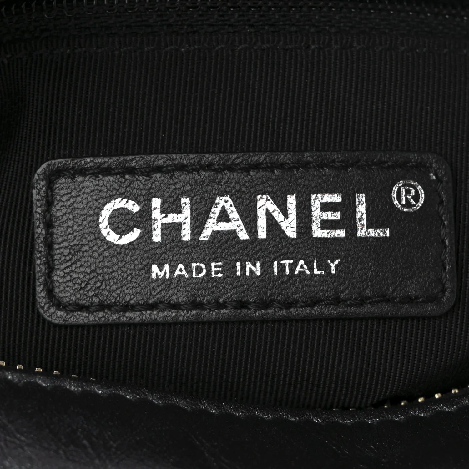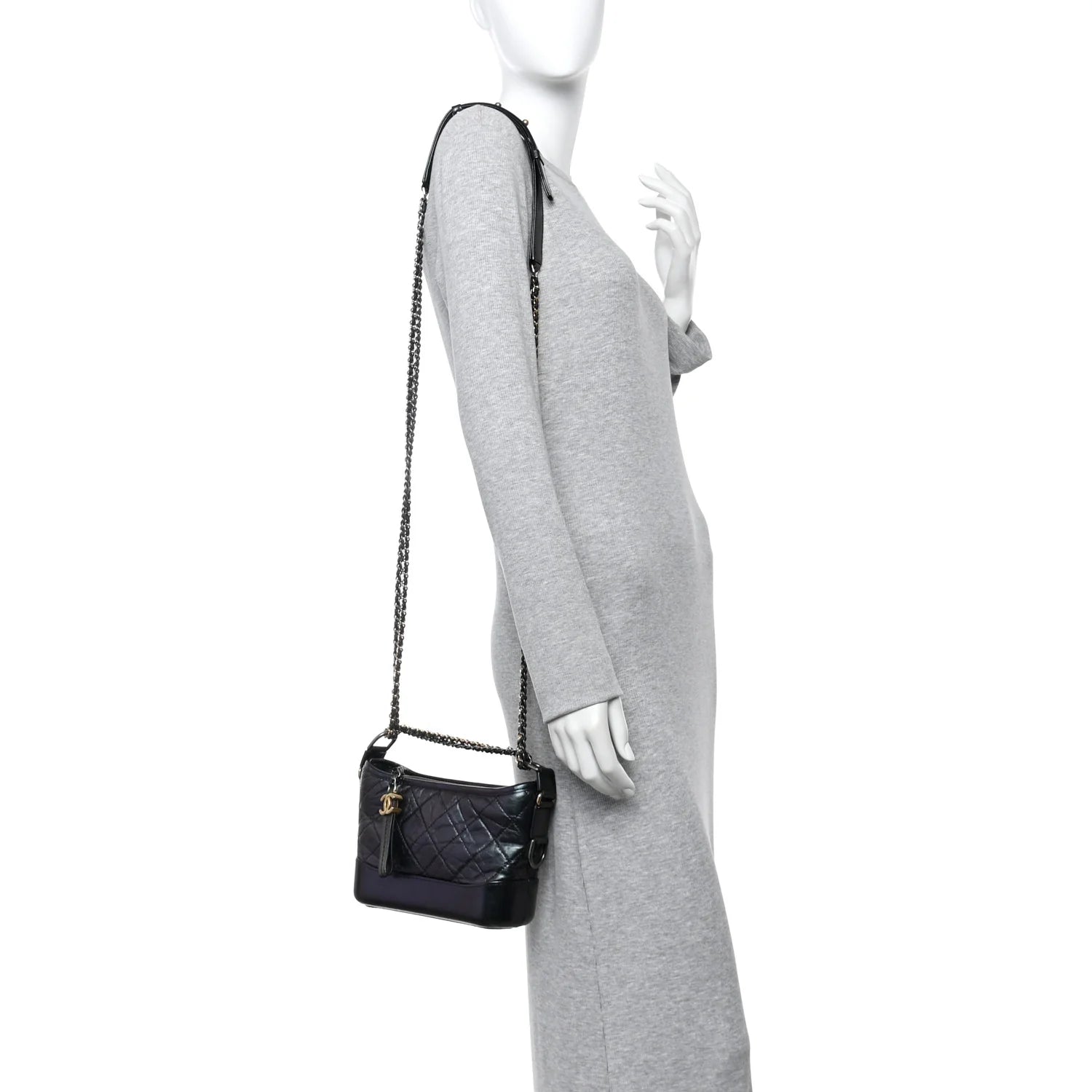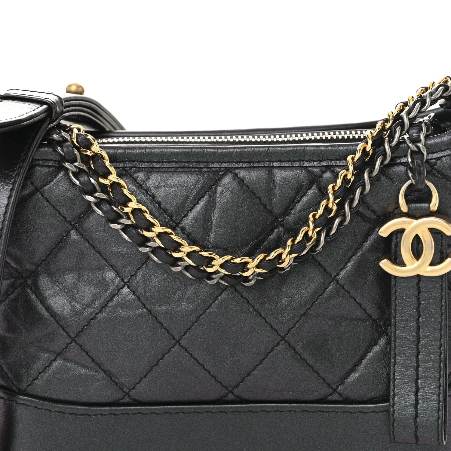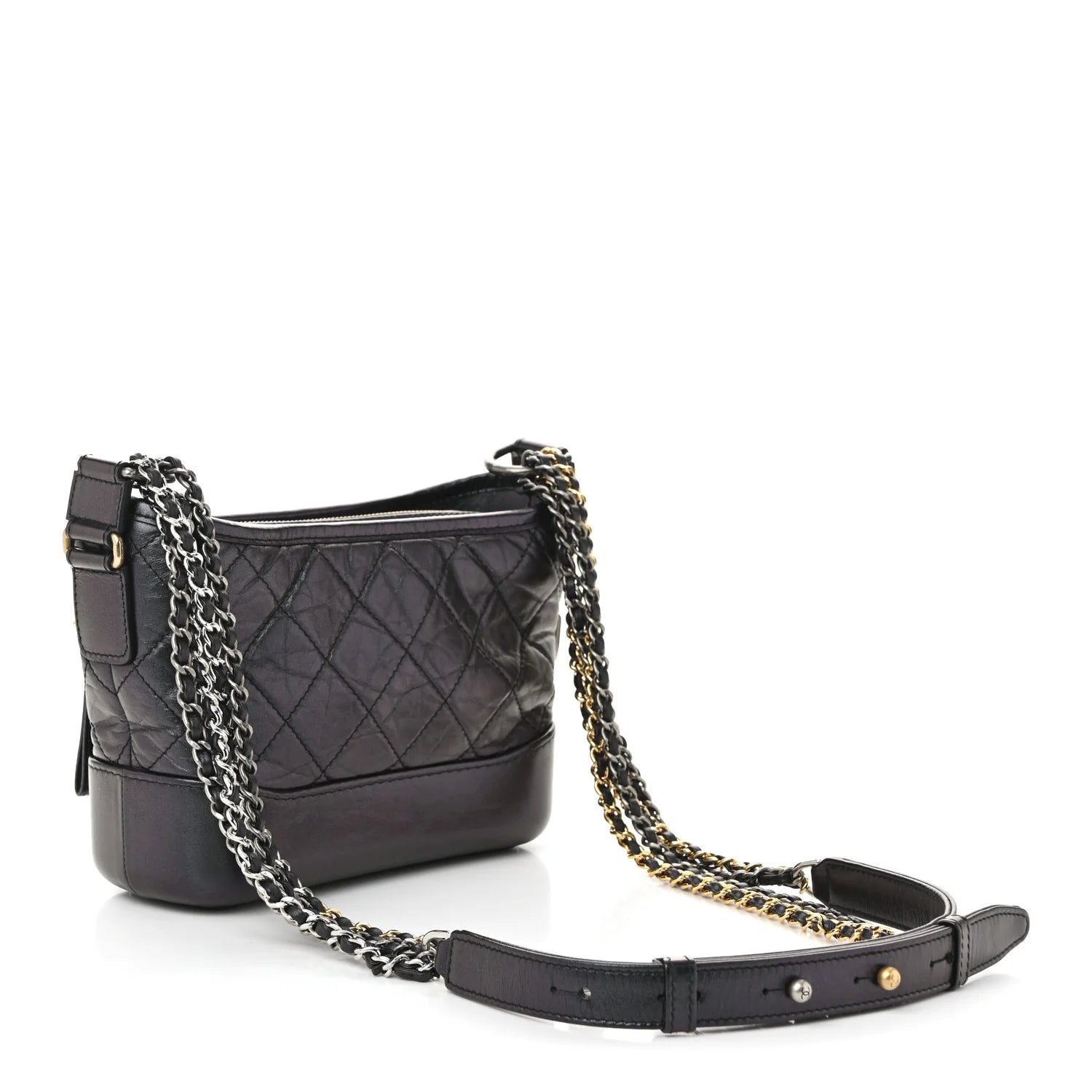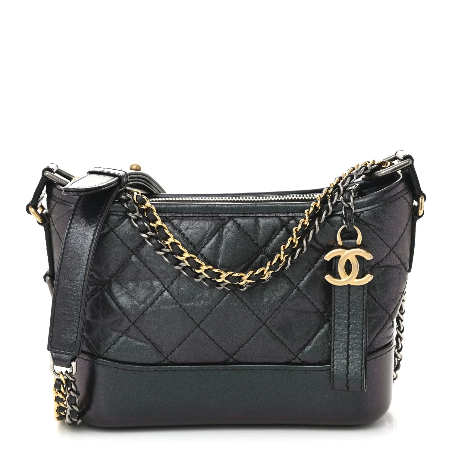 This is an authentic CHANEL Iridescent Aged Calfskin Quilted Small Gabrielle Hobo in Black. This stylish shoulder bag is crafted of diamond-stitched calfskin leather in iridescent black, with a smooth calfskin leather base. The bag features an adjustable leather-threaded gradient aged ruthenium to polished gold chain link shoulder strap. The top zipper opens to a black fabric interior with zipper and patch pockets.