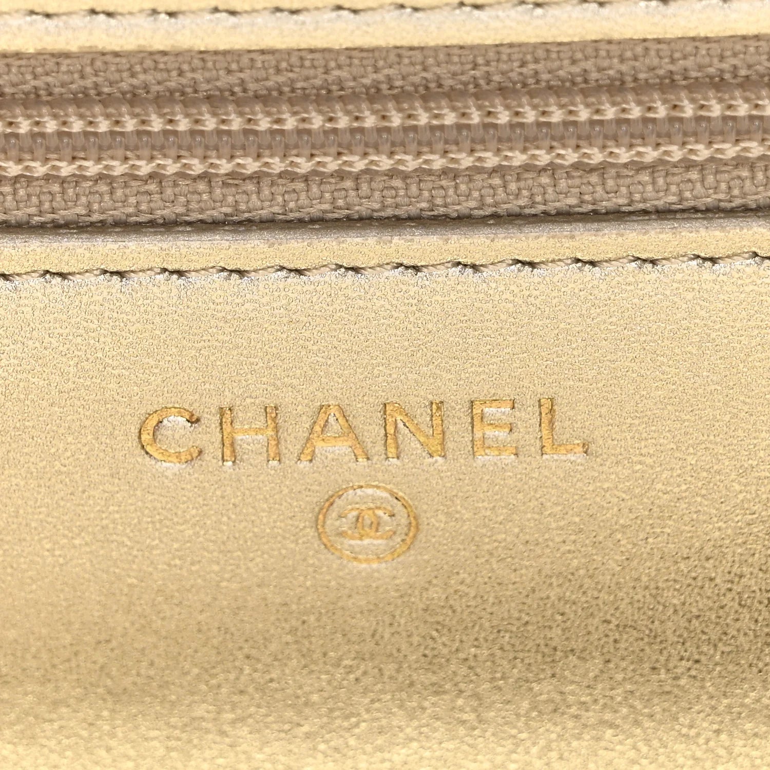 This is an authentic CHANEL Metallic Lambskin Quilted Wallet On Chain WOC in Gold. This stylish wallet is crafted of luxurious diamond quilted lambskin leather in gold. The bag features an extra-long gold chain link leather threaded shoulder strap and a small gold Chanel CC on the front. This opens with a magnet to a beige fabric interior with a leather panel of card slots.