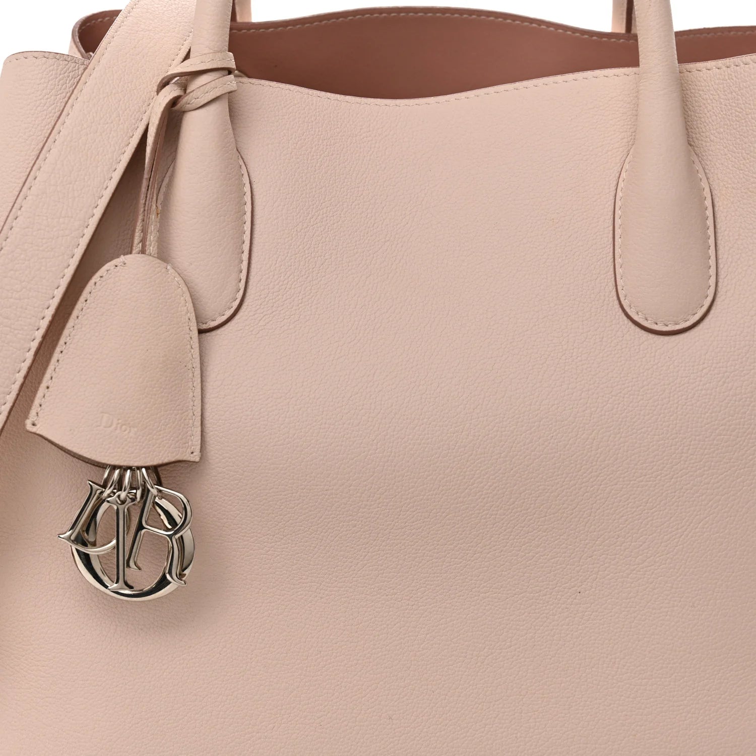 This is an authentic CHRISTIAN DIOR Supple Grained Calfskin Large Open Bar Tote in Rose Poudre. This elegant tote is crafted of grained calfskin leather in pink and features a polished silver Dior initials bag charm suspended from the rolled leather top handles. The bag comes with an optional, adjustable shoulder strap, and the top is open to a spacious leather interior with hanging pockets.