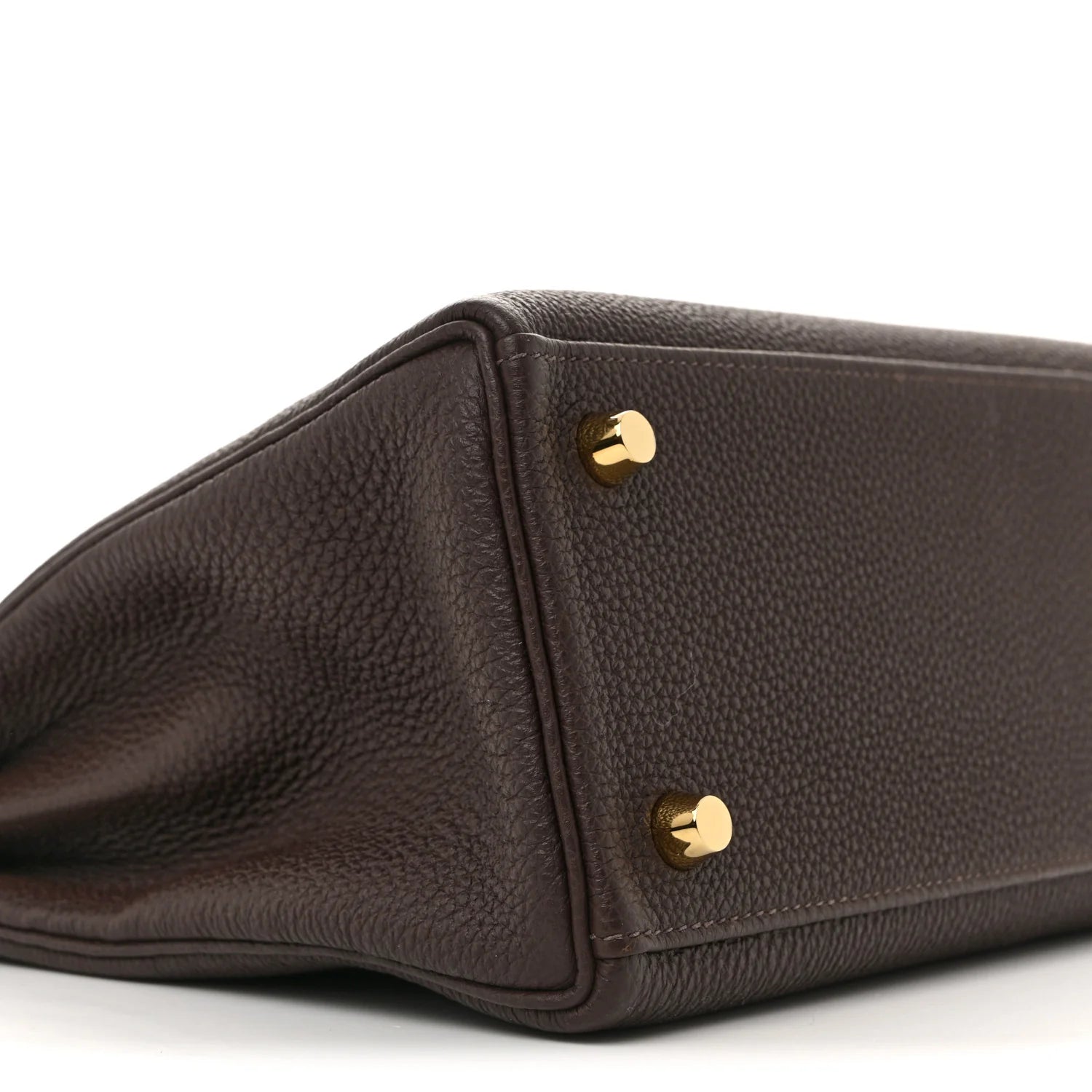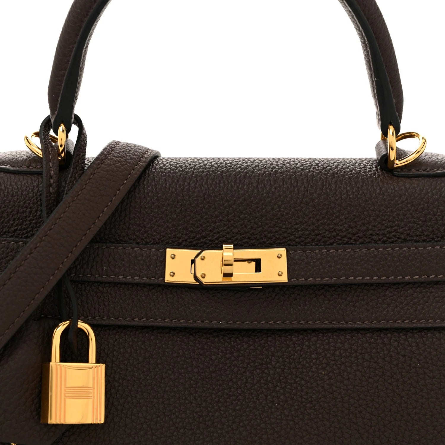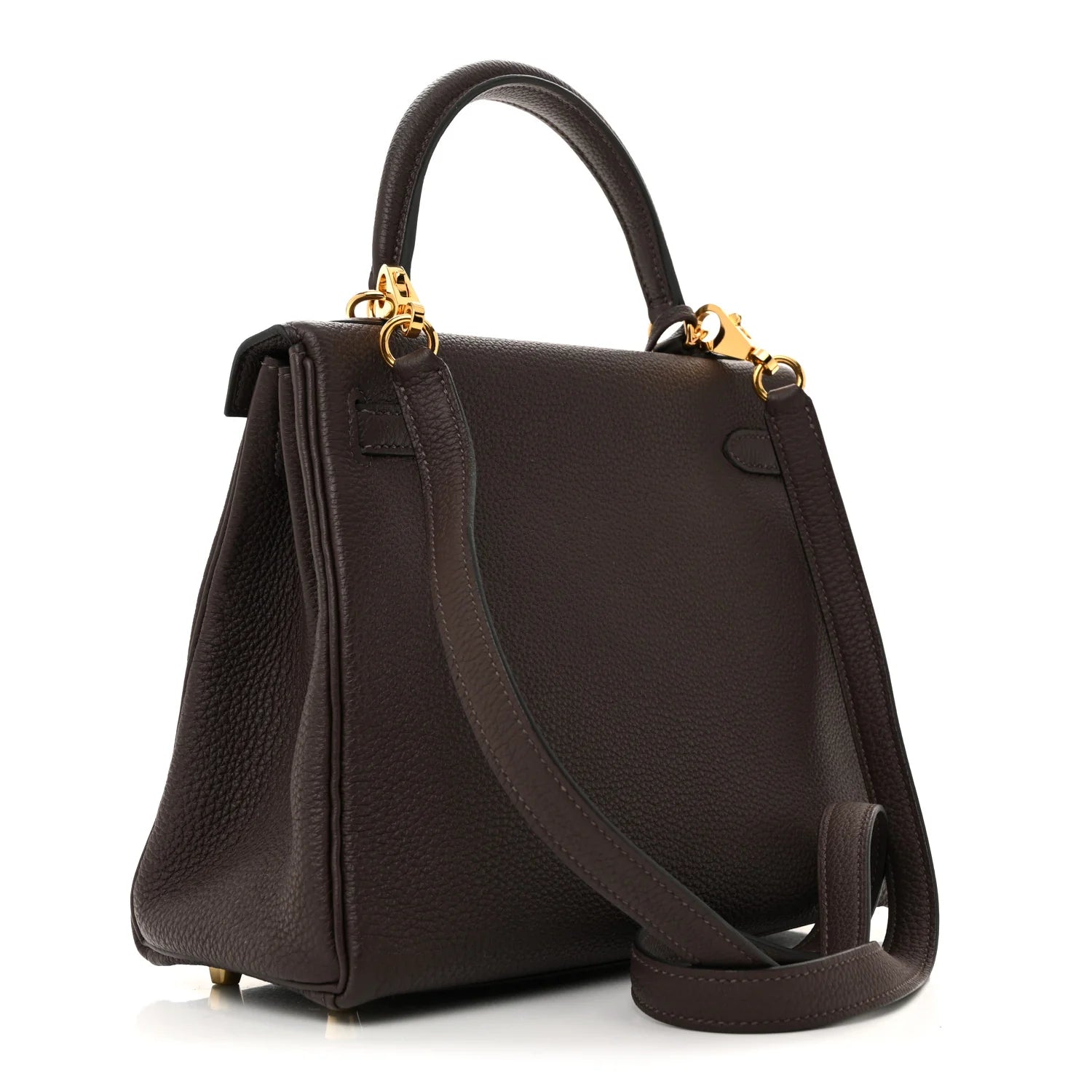 This is an authentic HERMES Togo Kelly Retourne 25 in Ebene. This chic and iconic handbag is expertly handcrafted of grained calfskin leather in brown. The bag features rolled leather top handles, a short front flap with a strap closure with polished gold plated hardware including a padlock and keys, as well as an optional shoulder strap. The top flap opens to a goatskin leather interior with zipper and patch pockets.